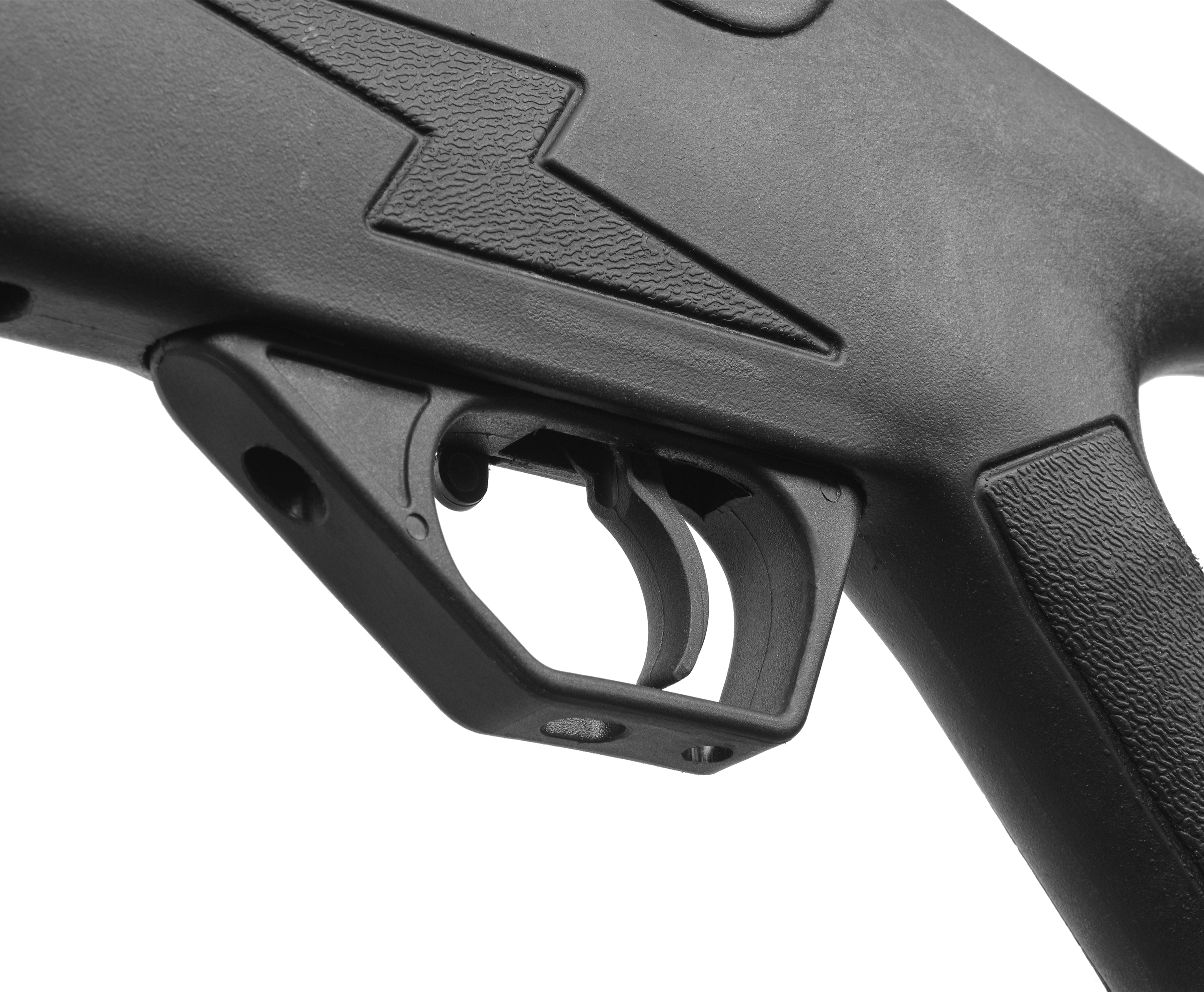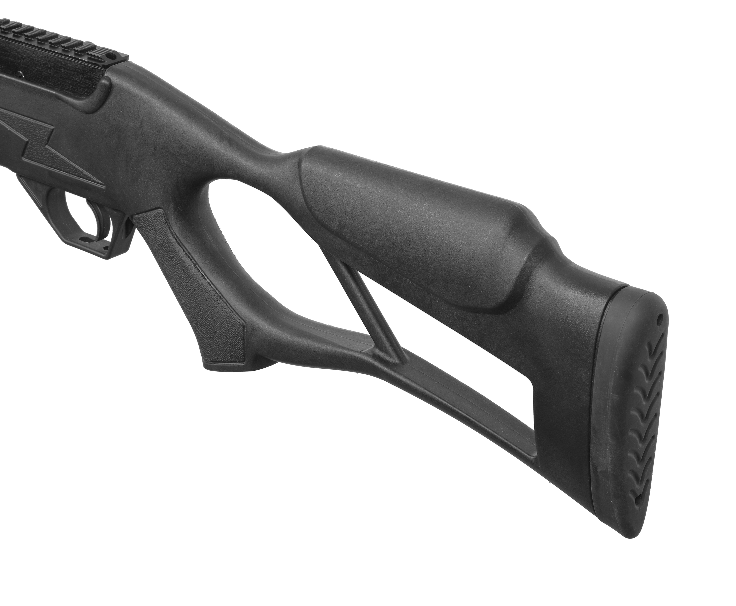 За счет применения пластика винтовка пневматическая Hatsan Flash получила легкий вес в пределах 2.5 кг. С учетом относительно компактных размеров 915 мм образец порадует хорошей управляемостью и не будет утомлять пользователя при продолжительном обращении. В то же время конструкция не накладывает ограничение на установку вспомогательного обвеса - в передней области цевья присутствует RIS планка под сошки, ЛЦУ или фонарь.