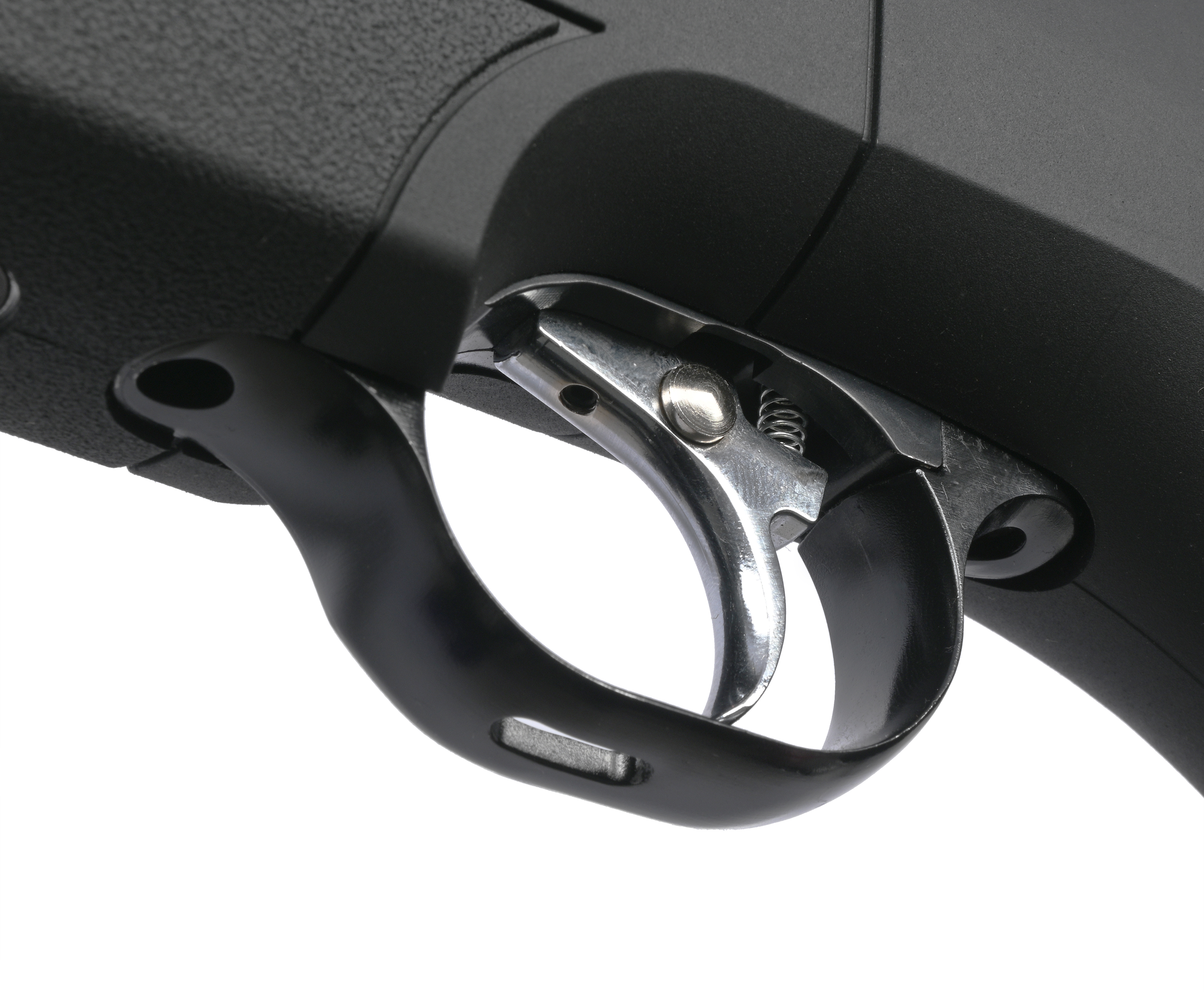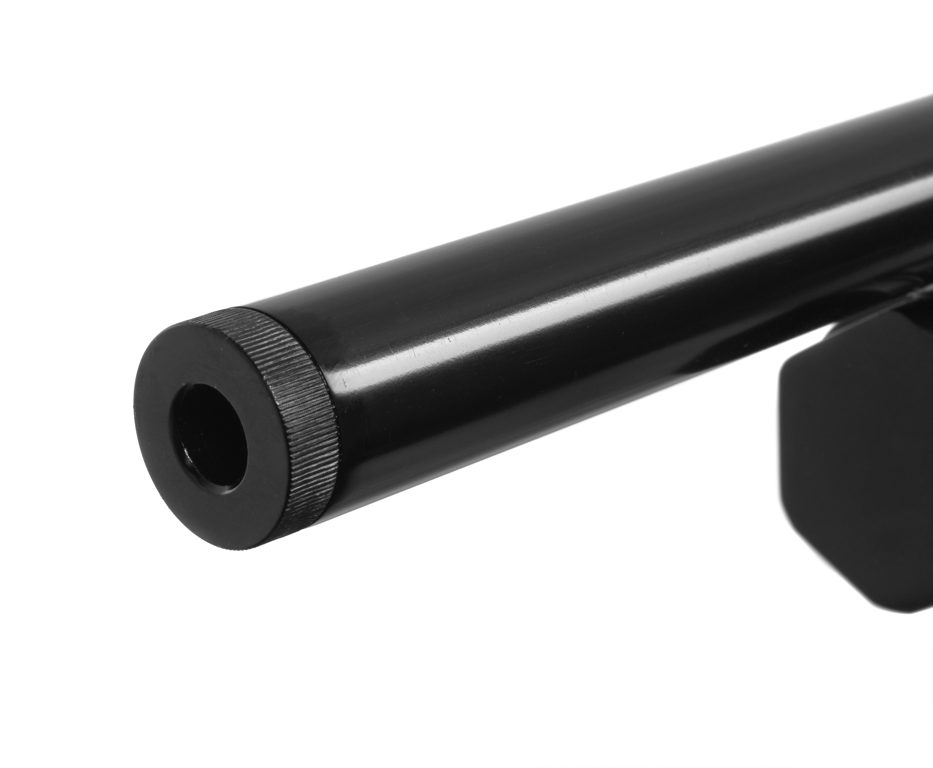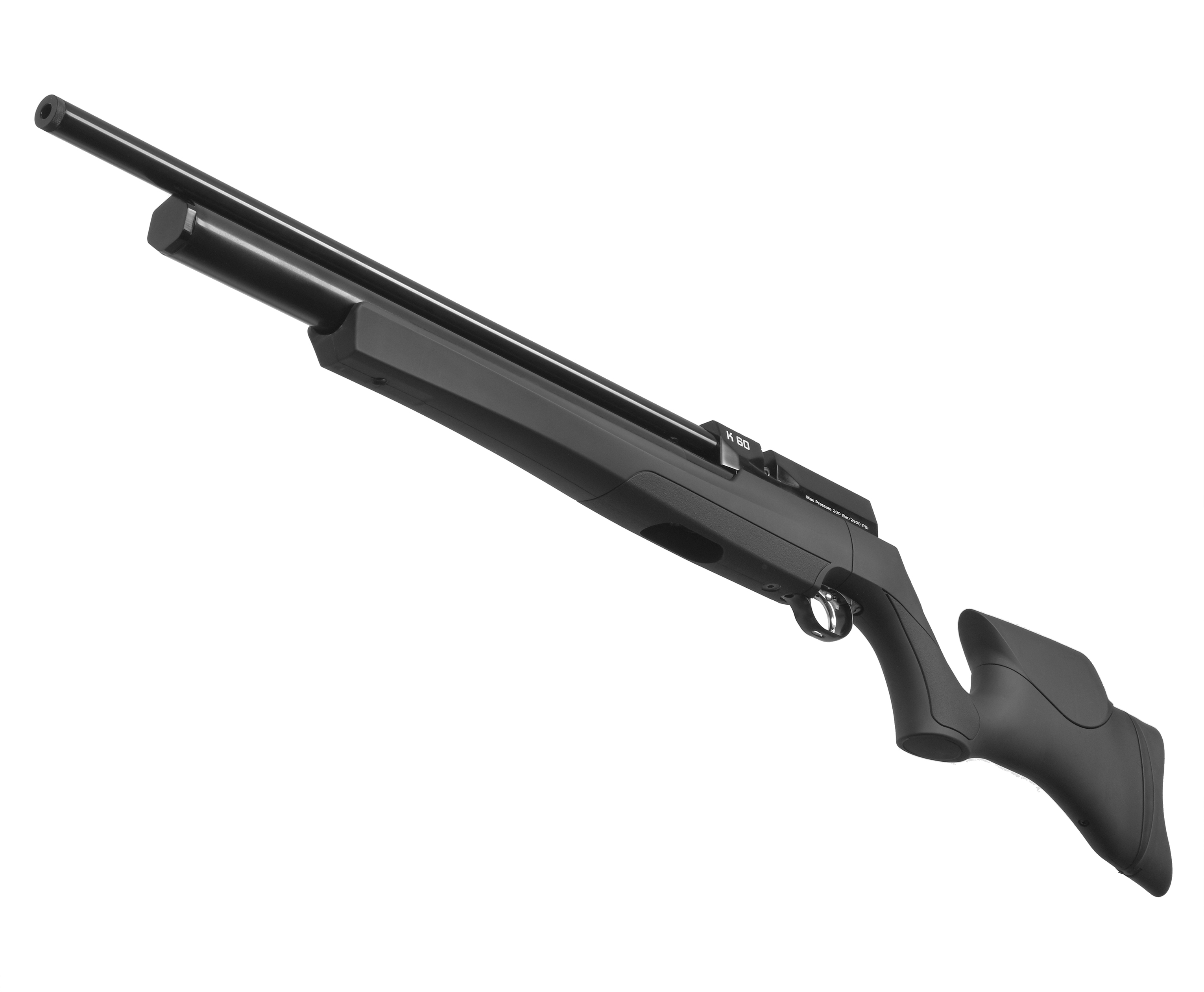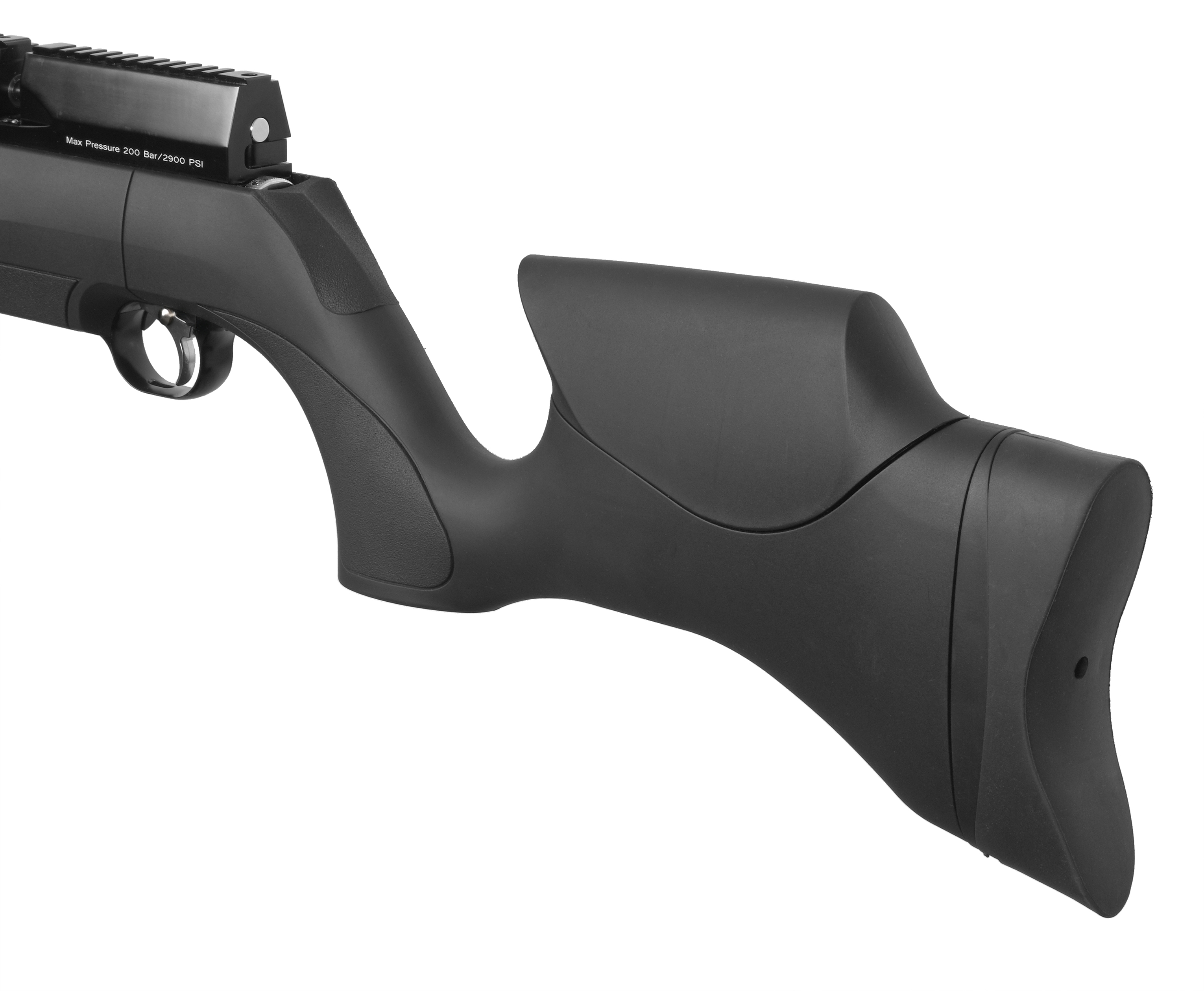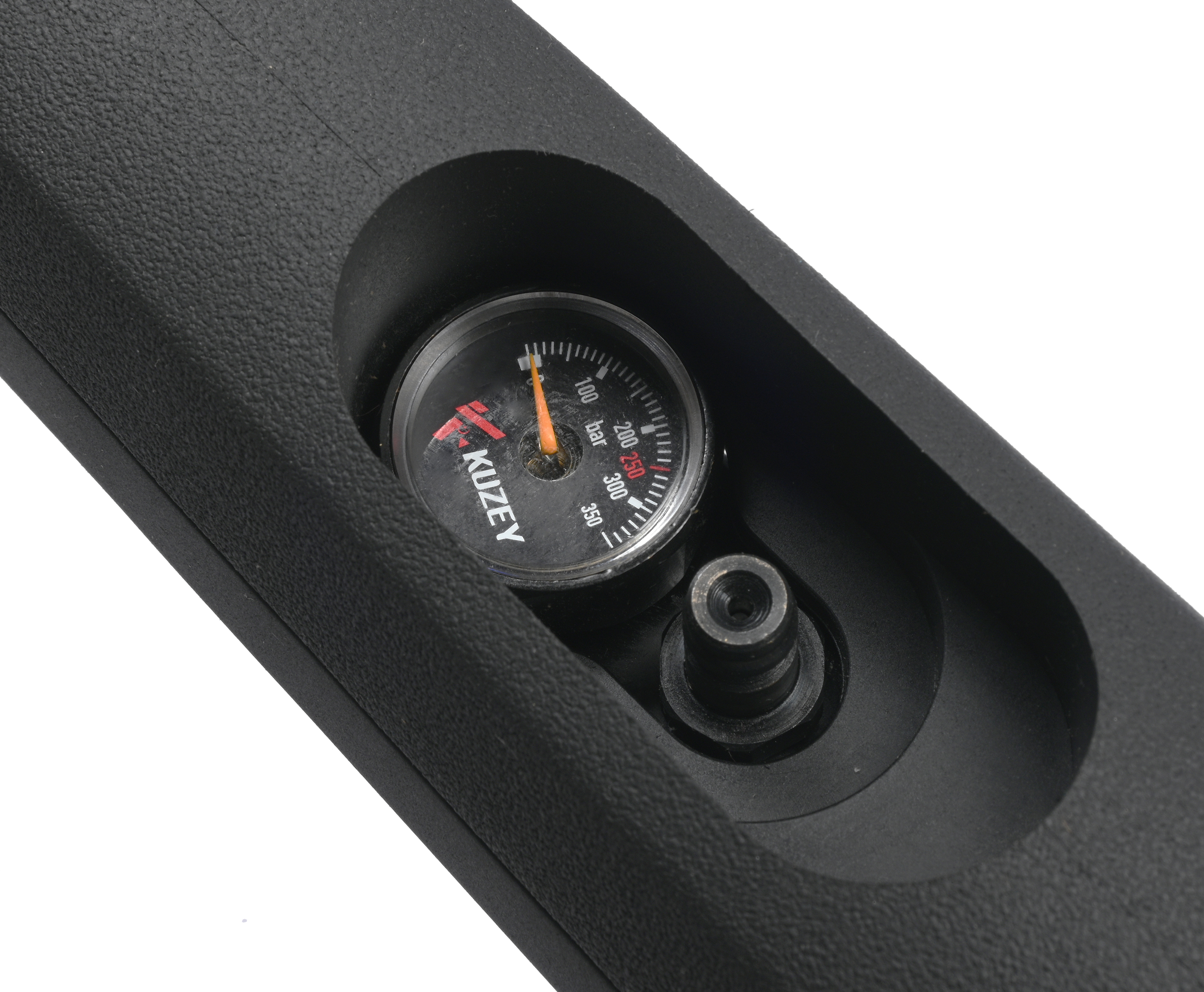 Разъем для подсоединения шланга через переходной штуцер, докупаемый отдельно, находится перед спусковой скобой с нижней стороны цевья. Там же интегрирован информативный манометр для контроля текущего давления в системе. Рекомендованный максимальный показатель оного, при котором винтовка работает в штатном режиме, составляет 250 Бар.