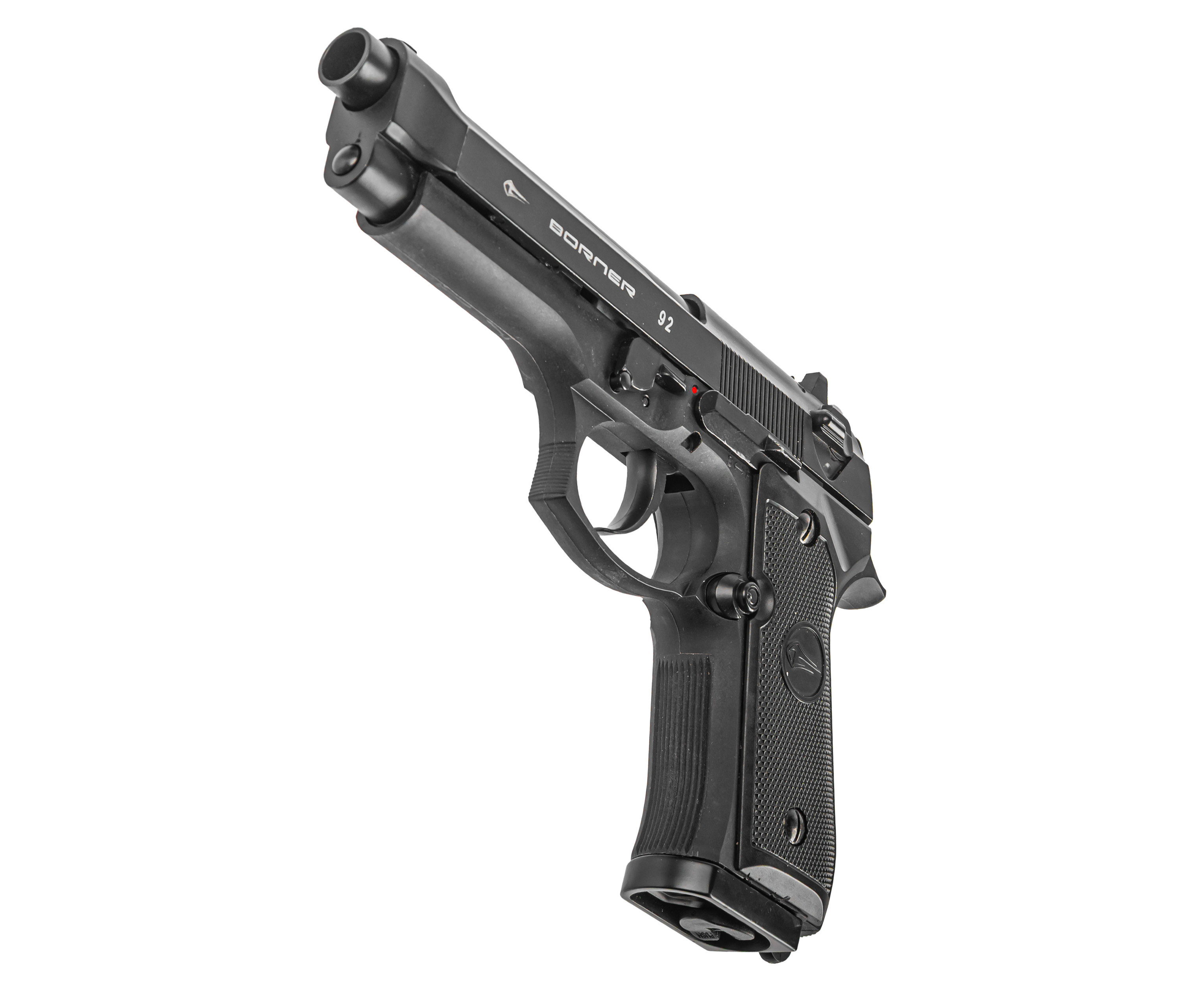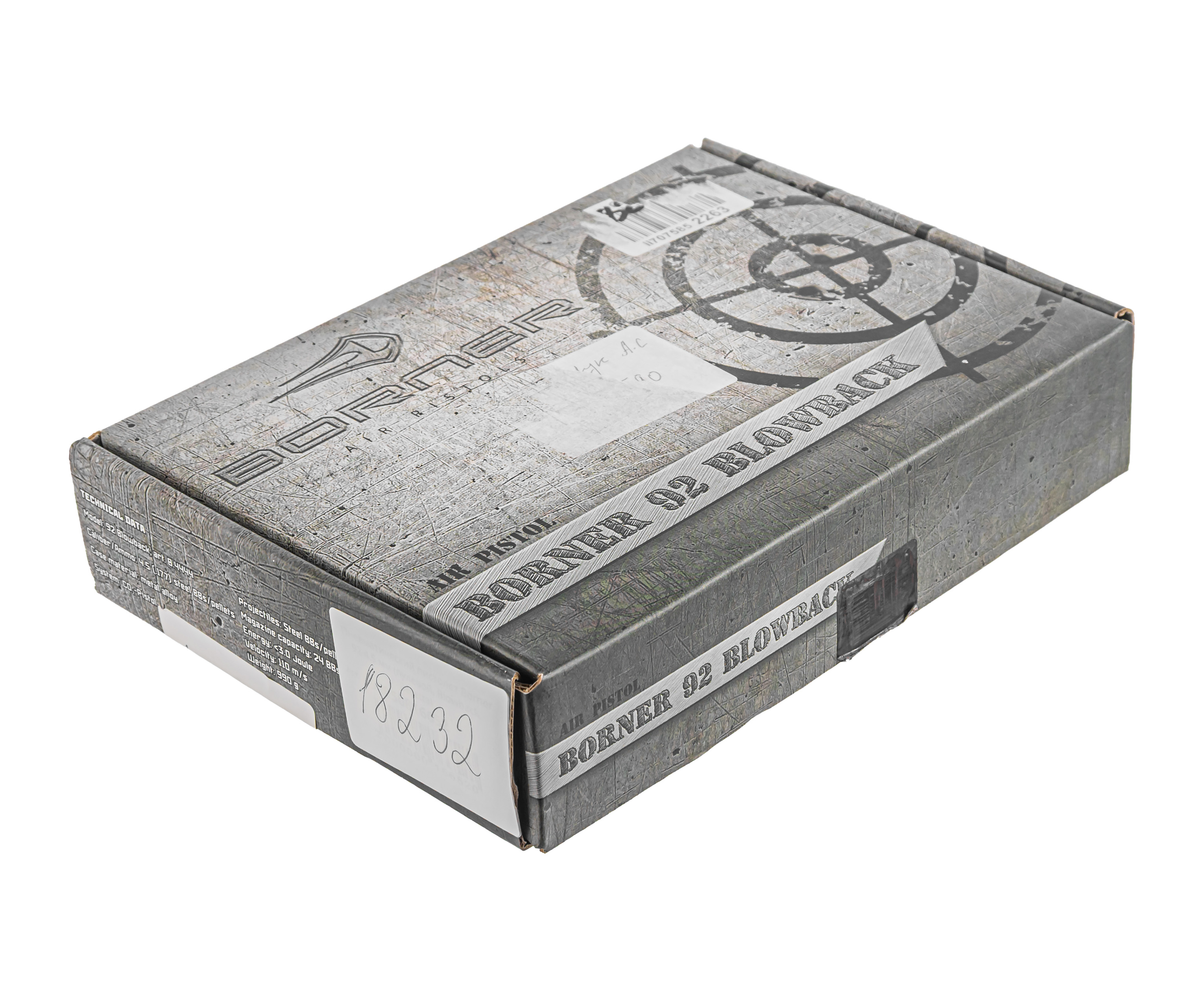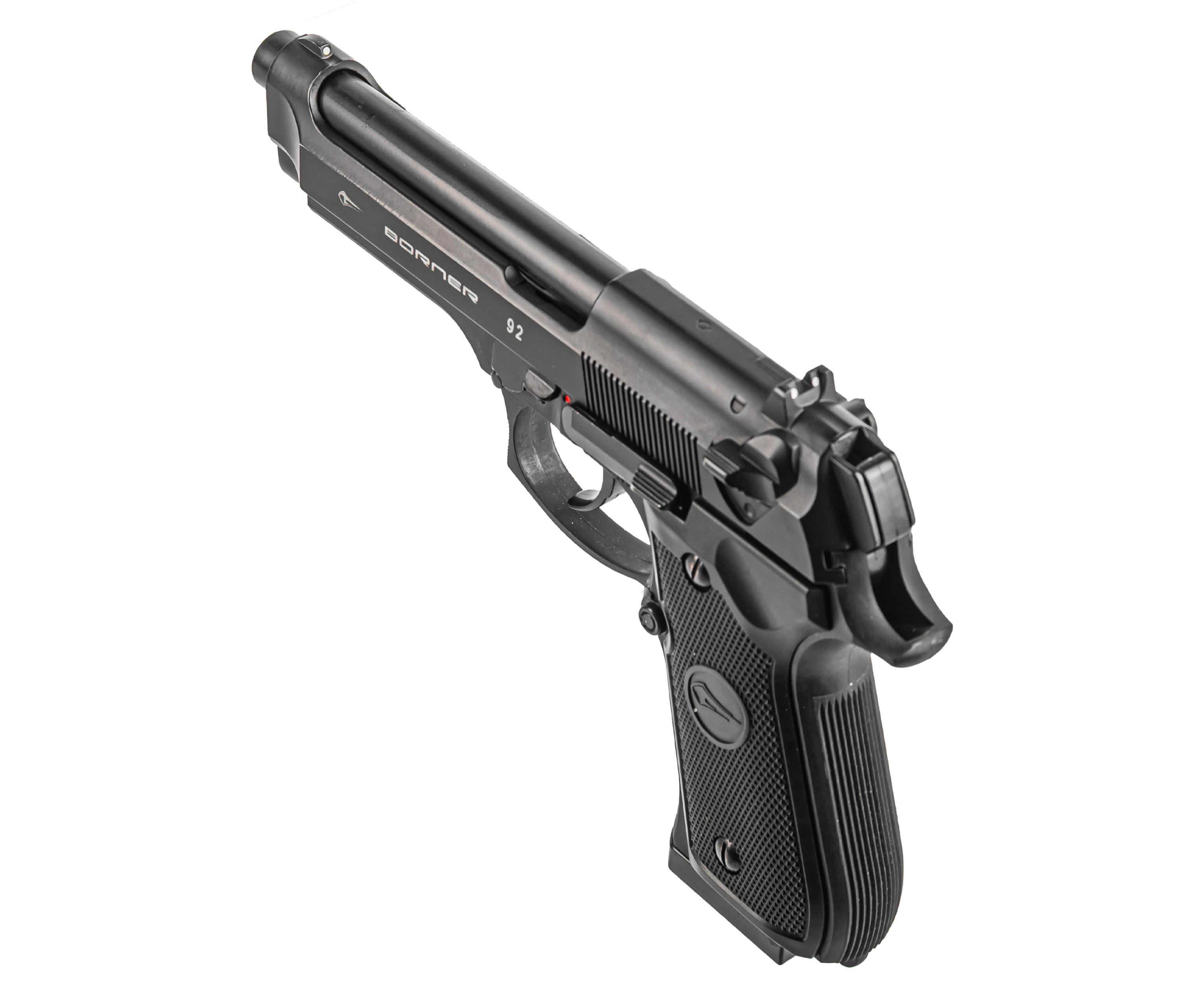 Представленный экземпляр дает получить опыт владения знаменитой итальянской Береттой. Пневматический пистолет Borner 92 обладает максимально приближенными к боевому прототипу габаритами и изготавливается преимущественно из металла, что обуславливает аутентичный вес изделия. Так масса образца составляет 950 грамм при общей длине 213 миллиметров.