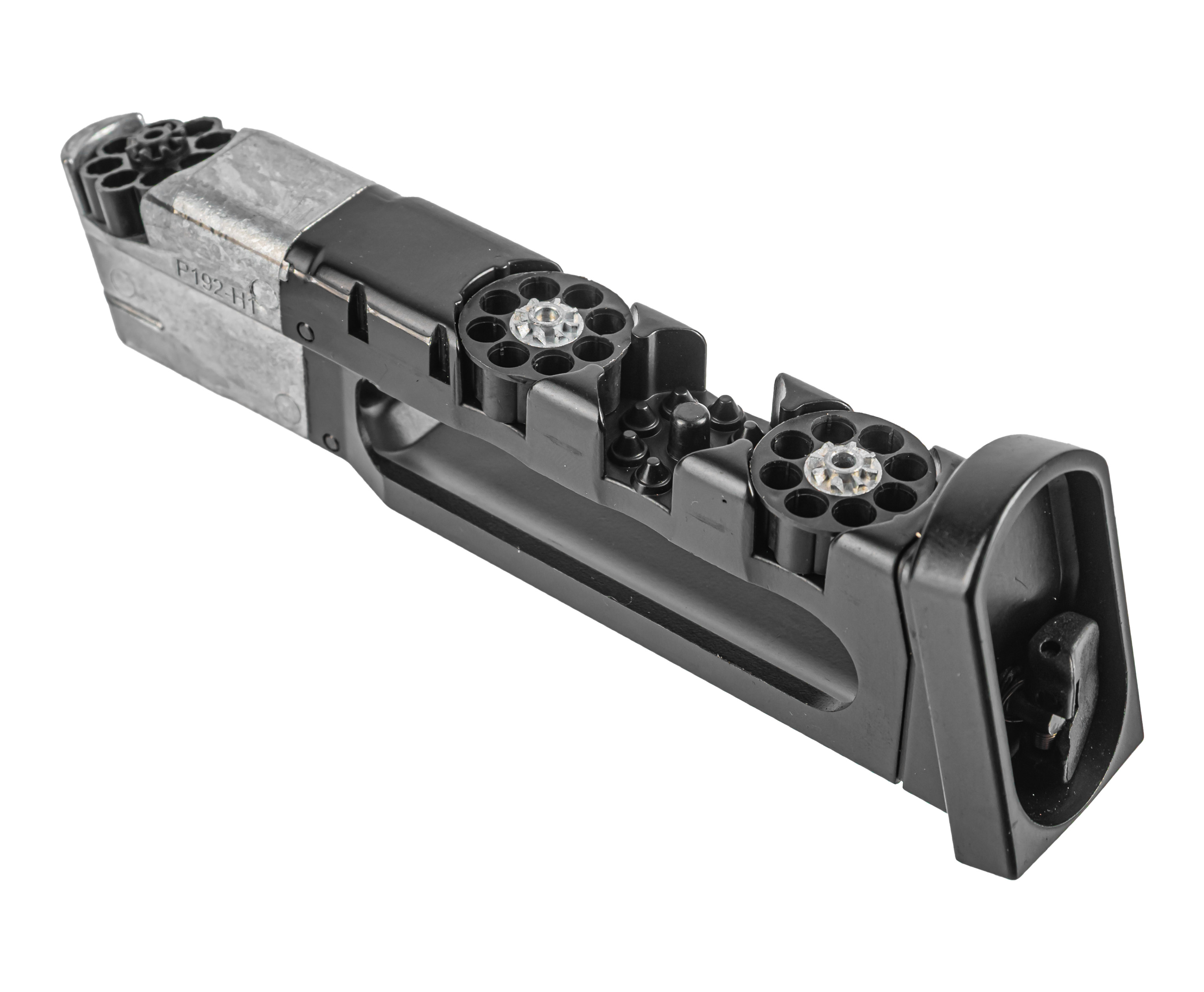 Модель функционирует в полуавтоматическом режиме, а в качестве боеприпасов выступают воланчиковые пули, что отличает данную версию от альтернативных решений. Метаемые снаряды калибром 4.5 мм досылаются в ствол из барабана на 8 слотов. В свою очередь указанный тип накопителя поставляется в количестве нескольких единиц - все они фиксируются в приемнике, расположенном в полноценном отмыкаемом из рукояти магазине.