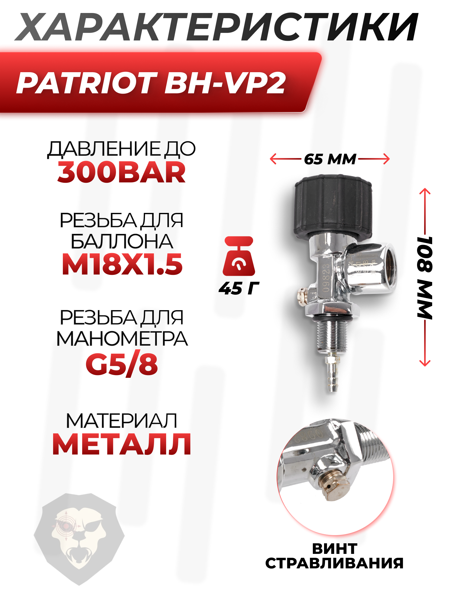 Артикул производителя BH-VP2 Вентиль для баллона высокого давления Patriot BH-VP2 (G5/8, клапан) по низкой цене 2890 руб. Модель со штрихкодом производителя Вы можете оплатить наложенным платежем с доставкой или в отделении транспортной компании (ПЭК, СДЭК, Boxberry). Ваш заказ со штрихкодом 2000000053578 забрать на почте с оплатой при получении в любой части Российской Федерации.