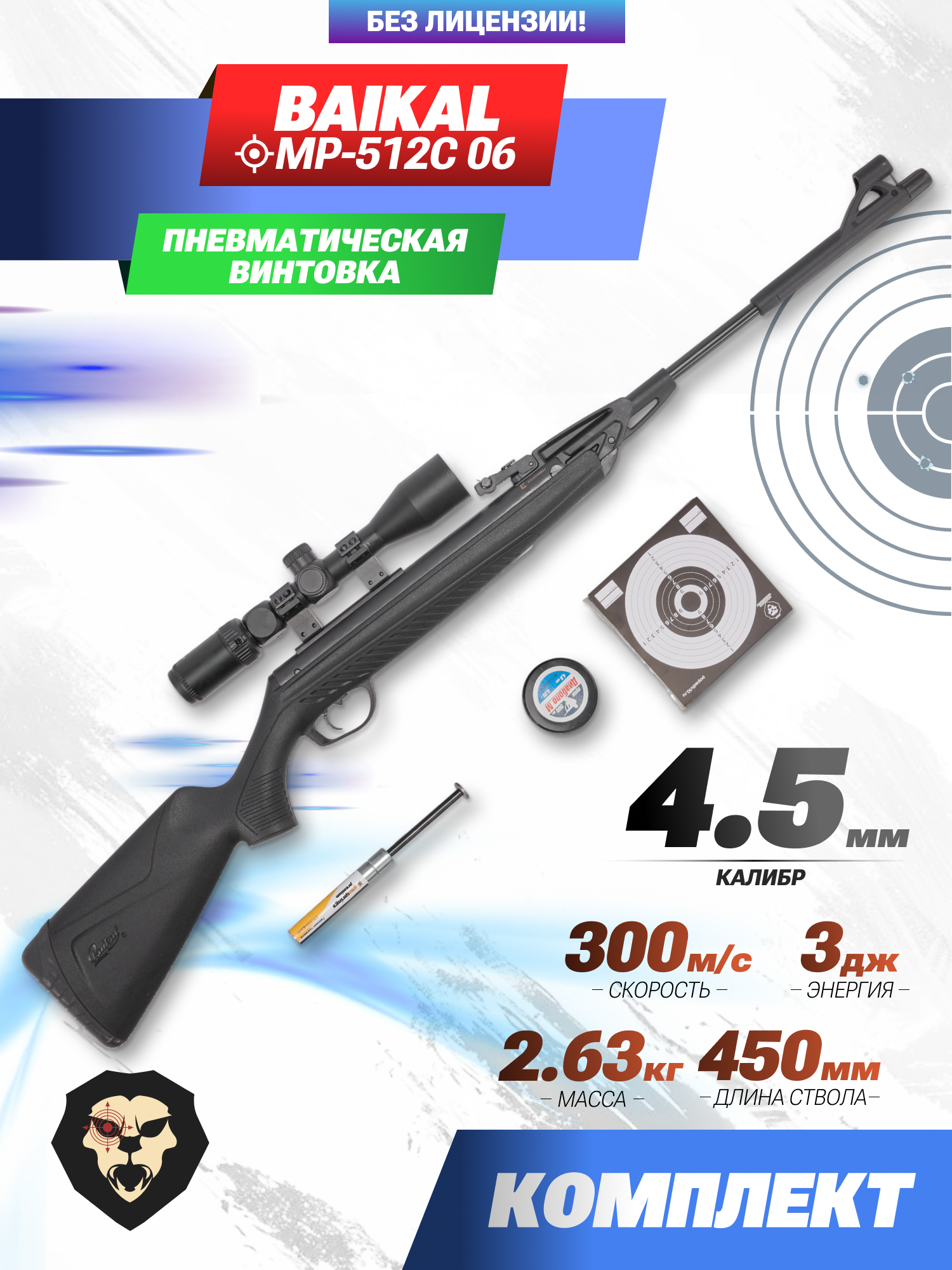 Винтовка Baikal МР-512С 06 4.5 мм комплект Hunter подарочный (прицел, кольца, мишени, пули, газовая пружина) купить в интернет-магазине Popadiv10.