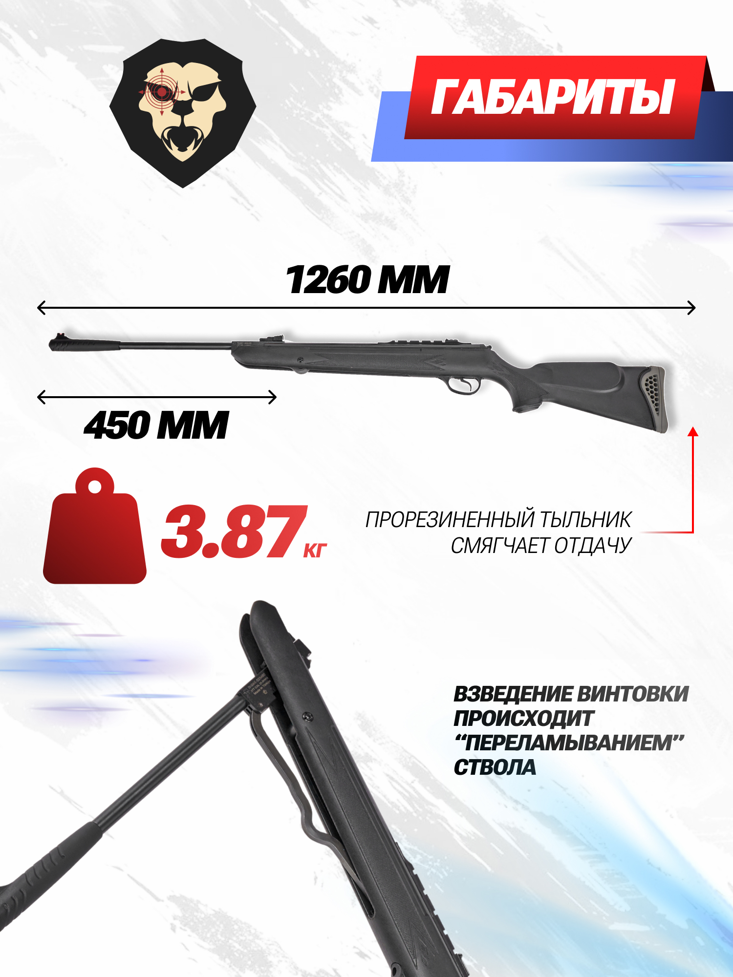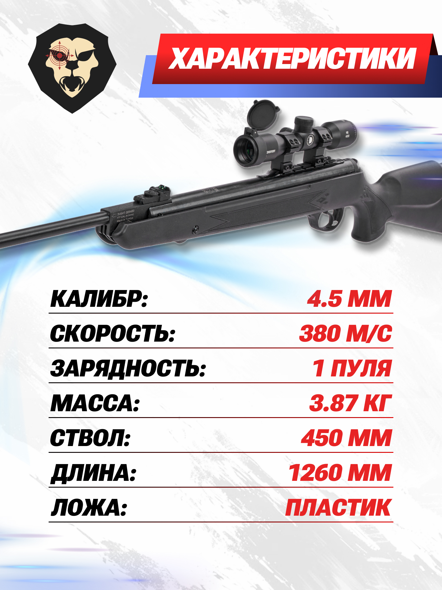 | Комплектация | Винтовка, оптический прицел, кольца, газовая пружина, мишени, пули, упаковка, краткая документация, копия сертификата (по запросу покупателя) |