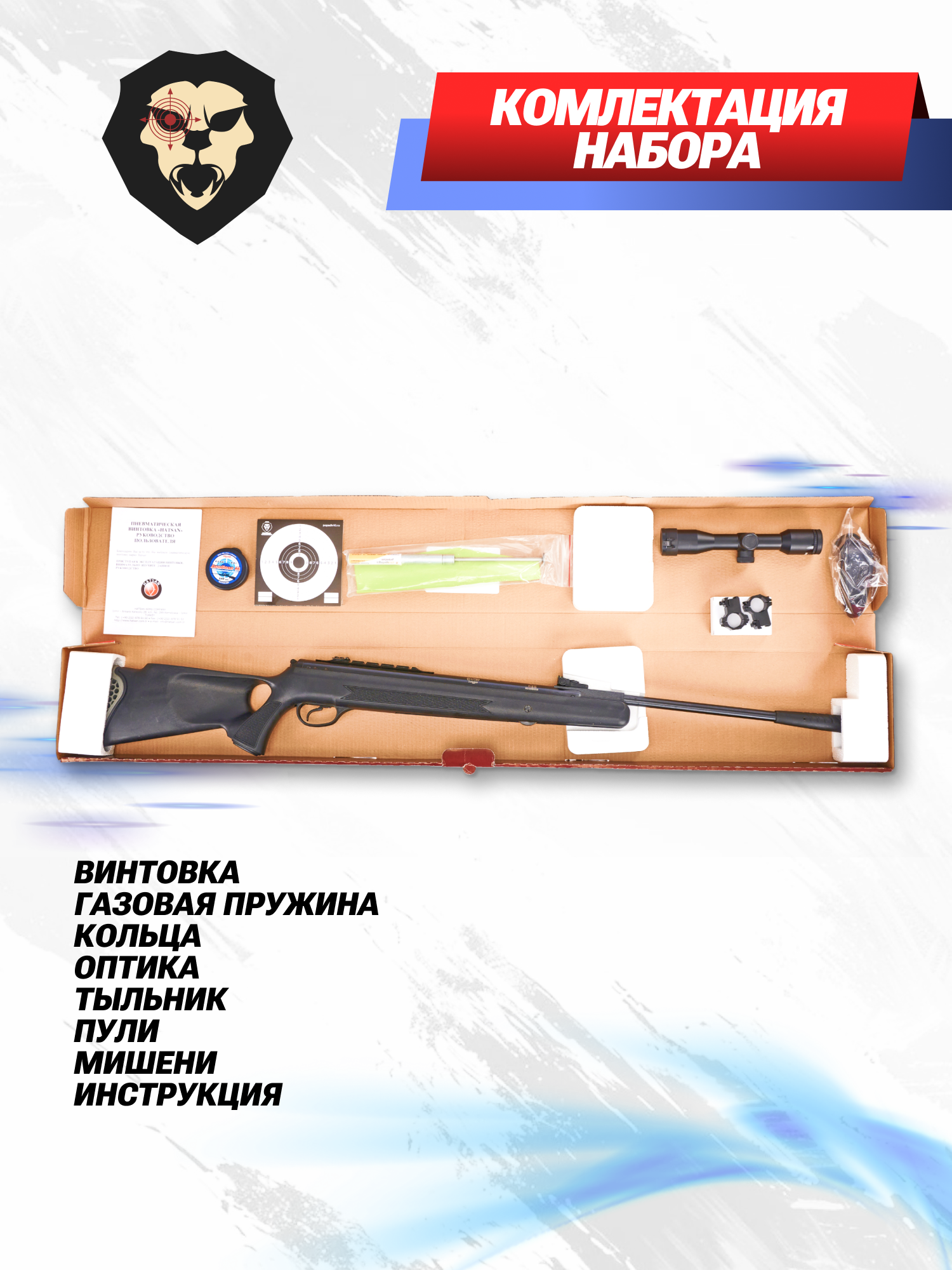 | Комплектация | Винтовка, оптический прицел, кольца, газовая пружина, мишени, пули, упаковка, краткая документация, копия сертификата (по запросу покупателя) |