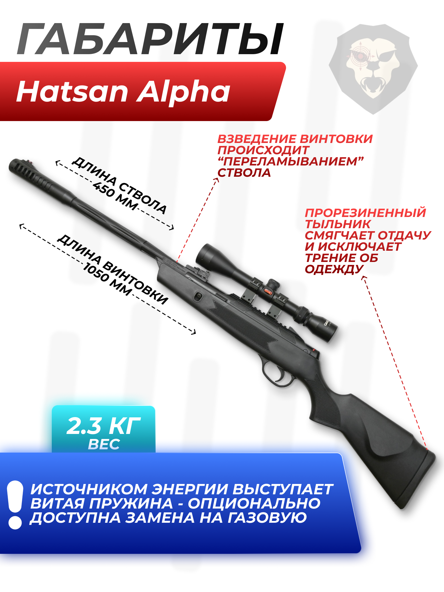 Информация о товаре "Пневматическая винтовка Hatsan Alpha 4.5 мм комплект Hunter №3 подарочный (прицел, кольца, набор для чистки, мишени, пули)" носит ознакомительный характер, и не является публичной офертой, определяемой положениями Статьи 437 Гражданского кодекса Российской Федерации, характеристики, внешний вид, цвет и комплектация могут быть изменены производителем без уведомления.