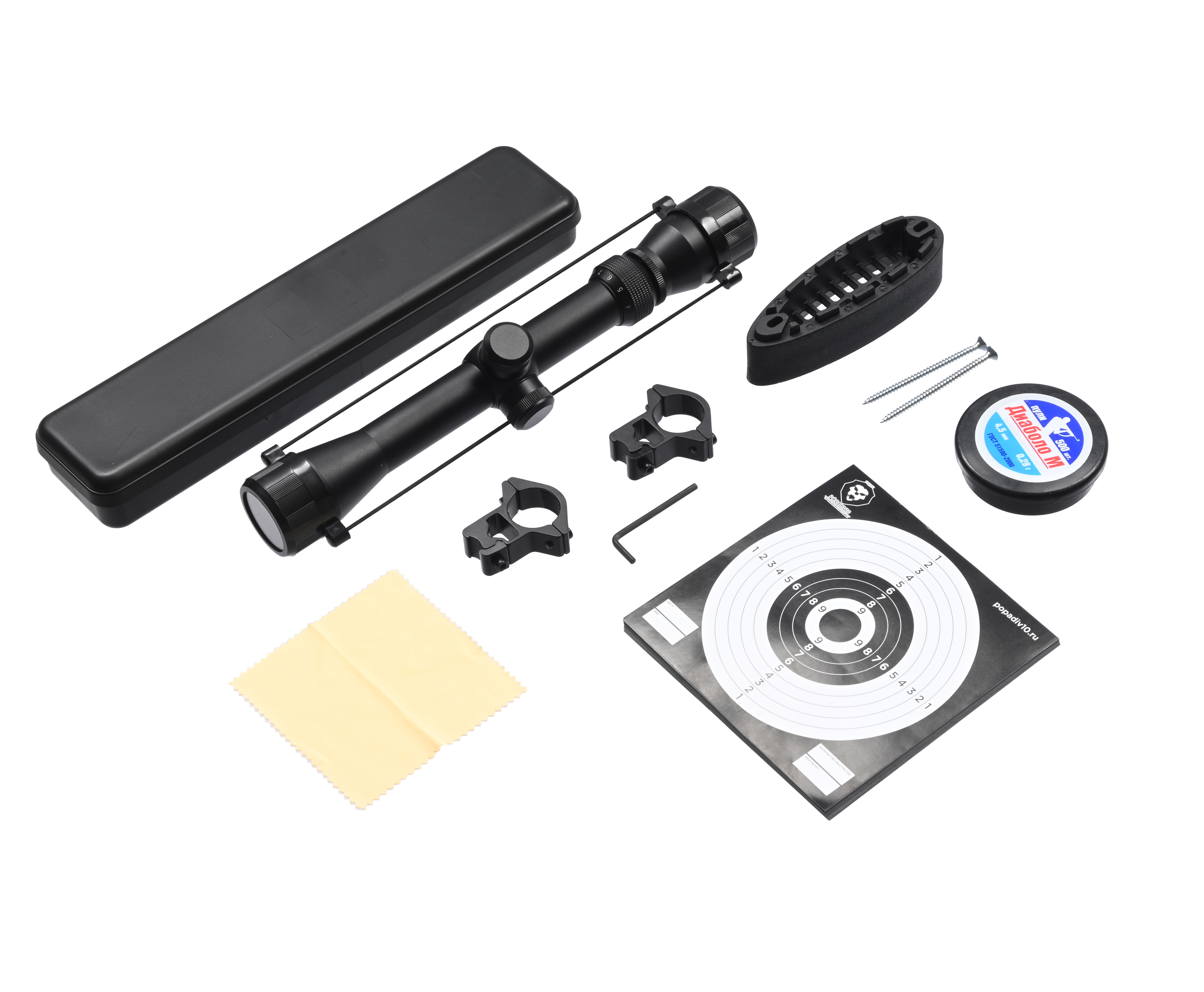 Комплектация | Винтовка, оптический прицел, кольца, набор для чистки, мишени, пули, тыльник, упаковка, краткая документация, копия сертификата (по запросу покупателя) |