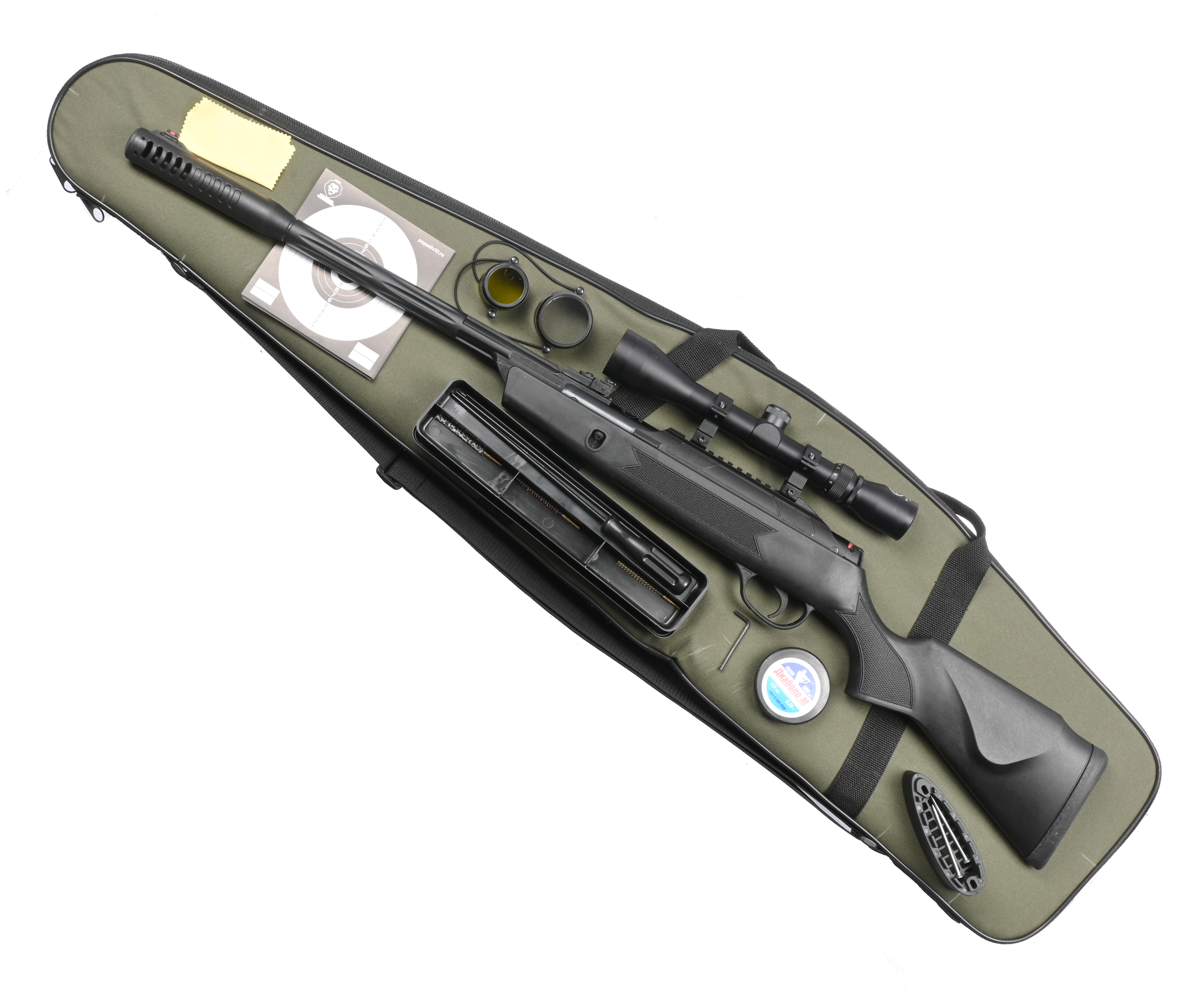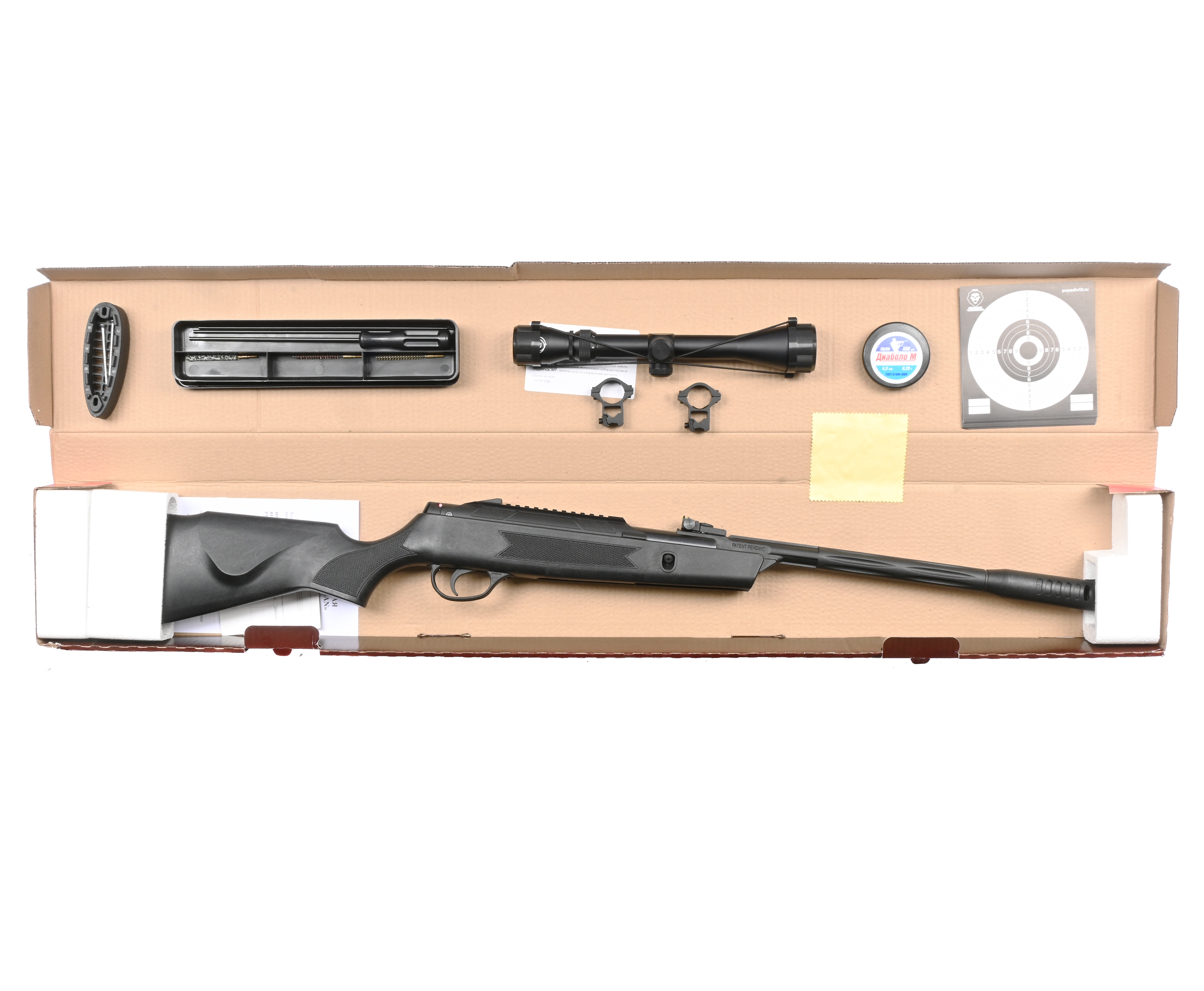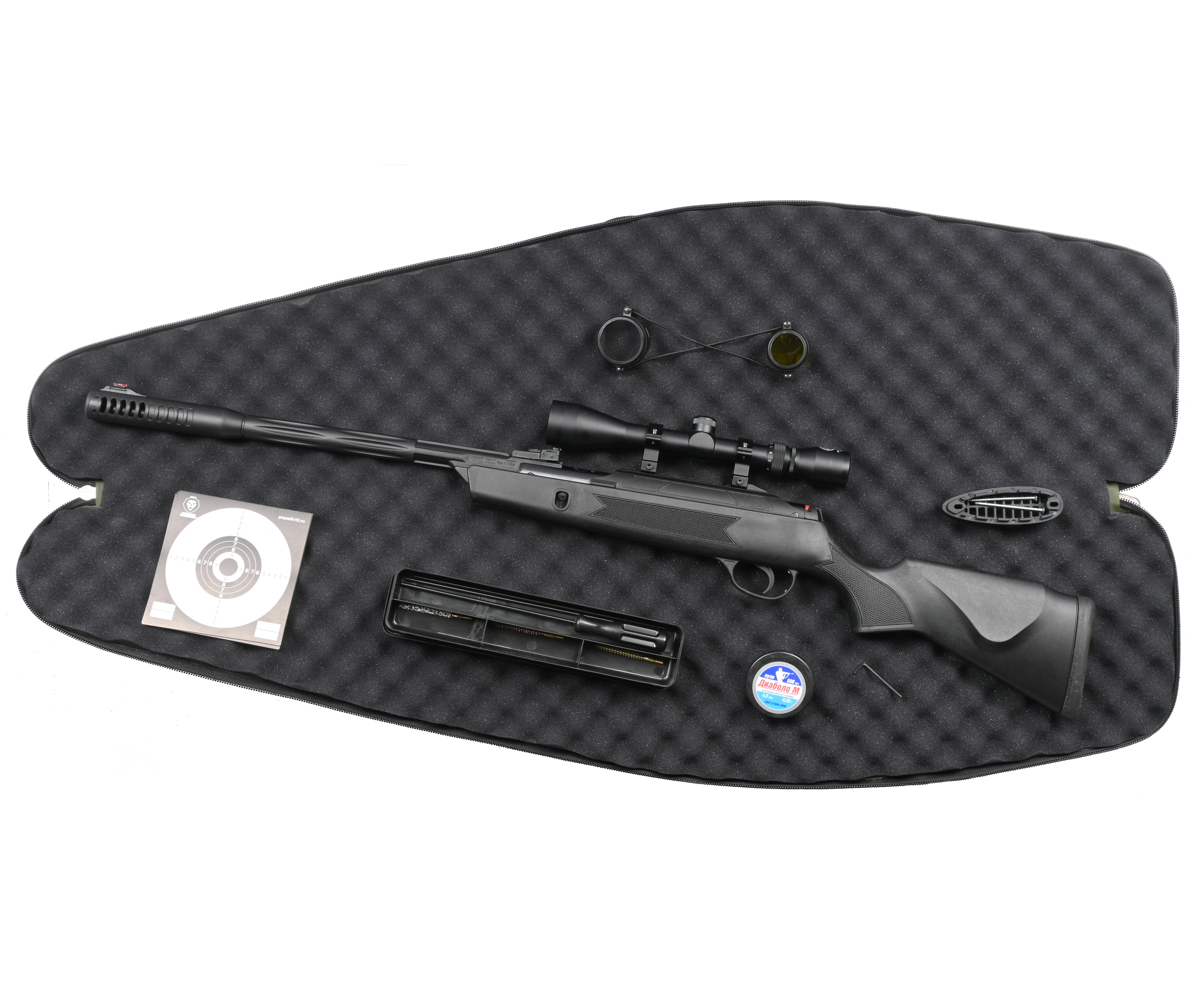 Также в набор добавили оптический прицел с двумя кольцами для установки. Конкретная винтовка оборудована комбинированной направляющей, которая включает в себя стандарты крепления Weaver 22 мм и «Ласточкин хвост» 11 мм. Кроме того, в комплектации присутствует набор мишеней для тренировки стрельбы, средства для очистки и тканевый чехол для переноса до места стрельбища.