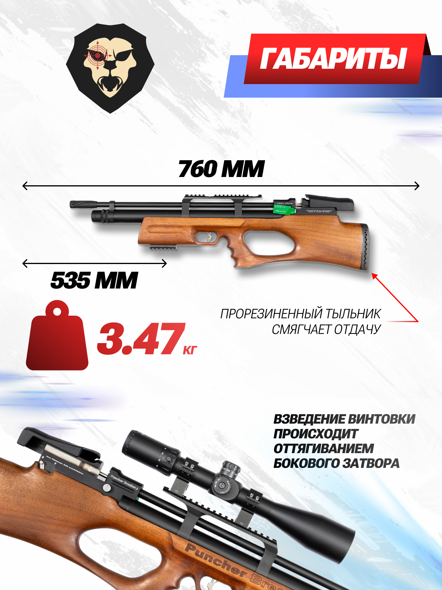 Ярчайшим примером подобных решений является рассматриваемый подарочный комплект Hunter - в нем присутствует все, что понадобится для эксплуатации пневматики. Ею здесь выступает винтовка Kral Puncher Breaker 3W с компоновкой Буллпап, за счет чего уменьшены размеры изделия - длина экземпляра составляет 760 миллиметров, из которых 53.5 сантиметра пришлось на нарезной бланк.
