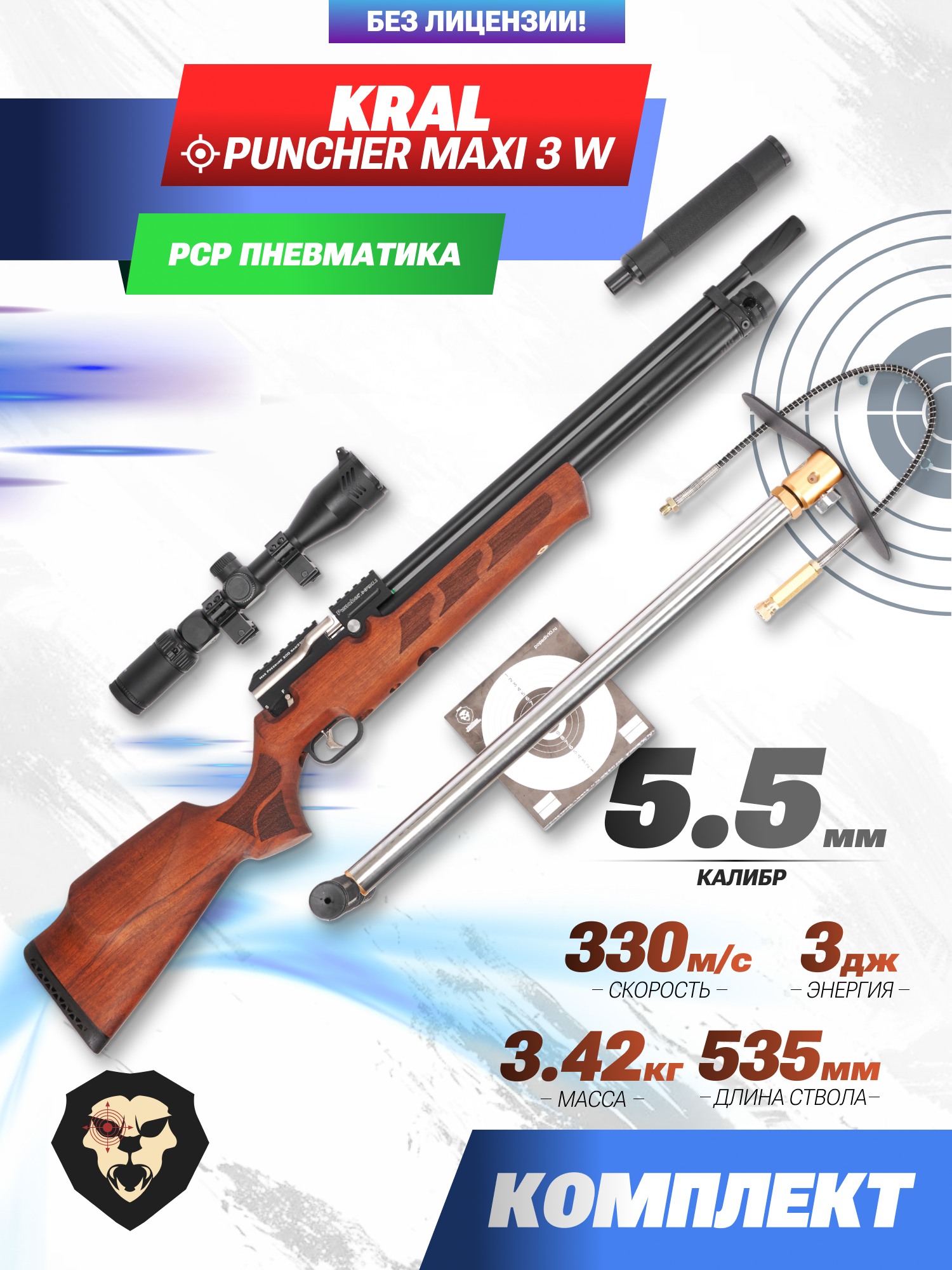 Винтовка Kral Puncher Maxi 3 W 5.5 мм комплект Hunter подарочный (орех, насос, переходник, прицел, кольца, модератор, пули, мишени) купить в интернет-магазине Popadiv10.