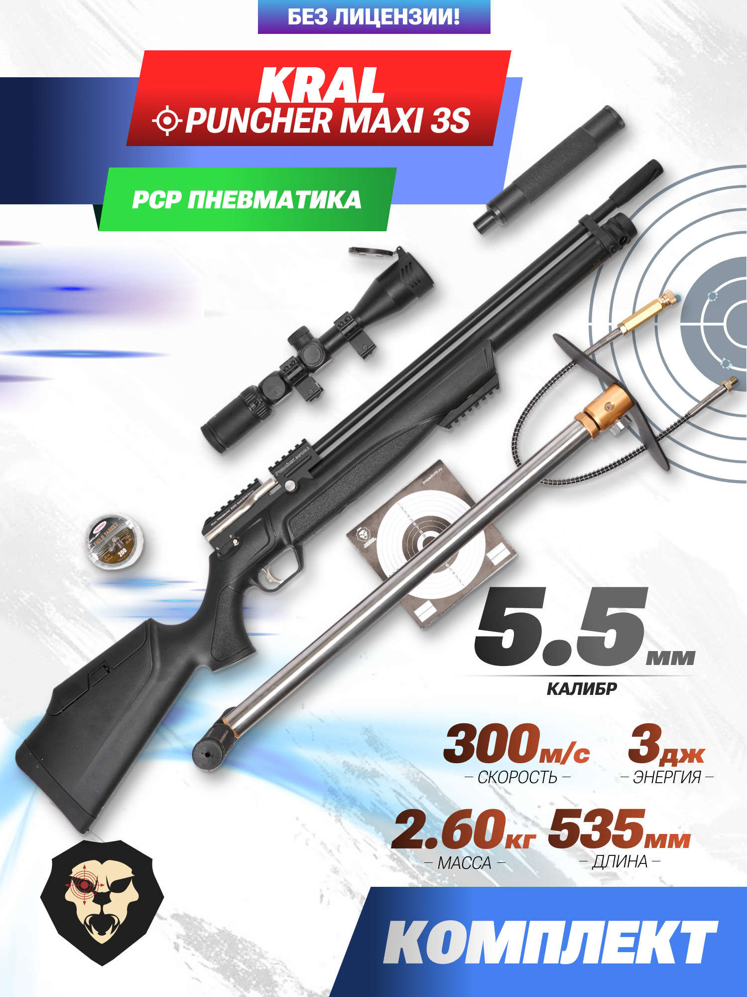 Винтовка Kral Puncher Maxi 3S 5.5 мм комплект Hunter подарочный (пластик, прицел, кольца, насос, переходник, модератор, пули, мишени) купить в интернет-магазине Popadiv10.