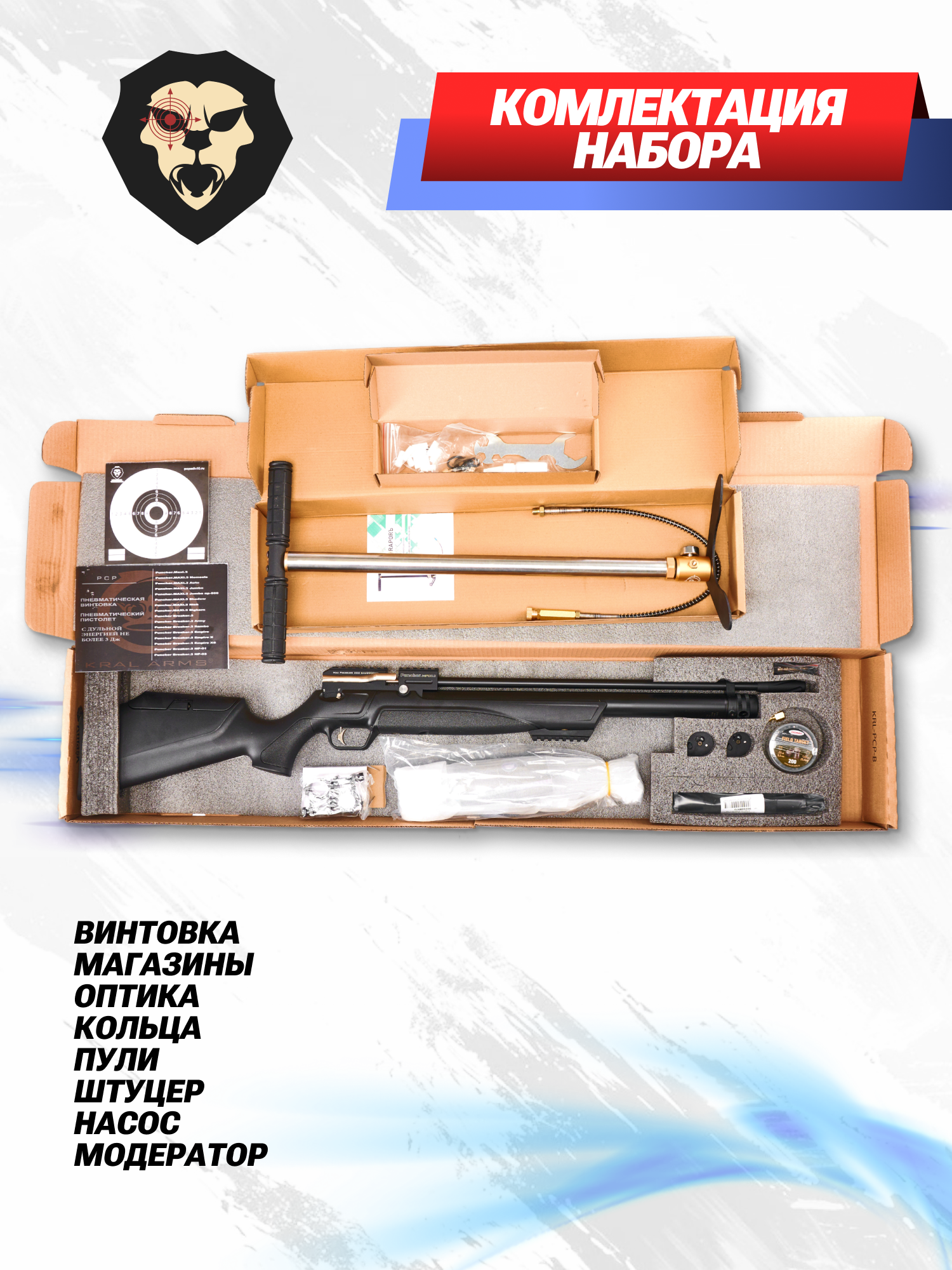| Комплектация | Винтовка, магазин - 2 шт, заправочный штуцер, однозарядный лоток, насос с принадлежностями, прицел, кольца, пули, модератор, мишени, упаковка, краткая документация, копия сертификата (по запросу покупателя) |