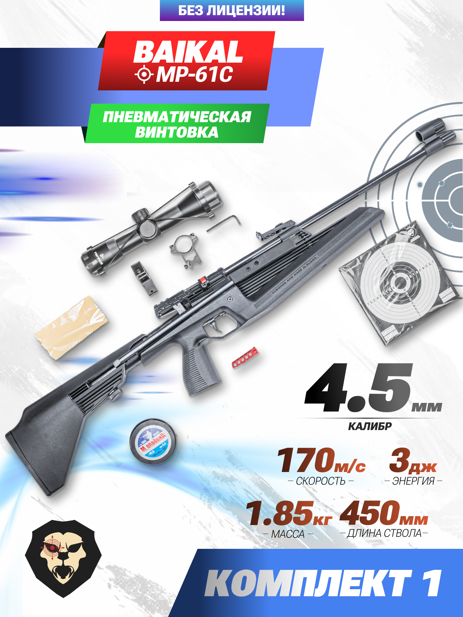 Винтовка пневматическая Baikal МР-61С комплект Hunter №1 подарочный (прицел, кольца, мишени, пули) купить в интернет-магазине Popadiv10.