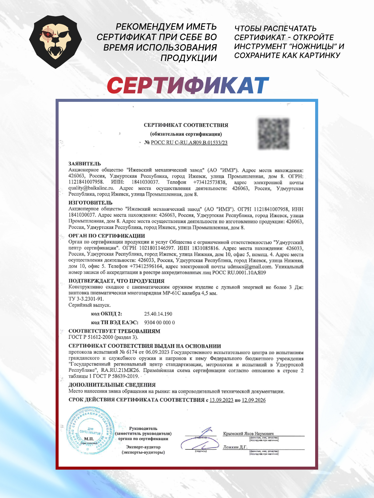 сертификат, паспорт, взрыв схема Сертификат на Винтовка пневматическая Baikal МР-61С комплект Hunter №1 подарочный (прицел, кольца, мишени, пули) Паспорт на Винтовка пневматическая Baikal МР-61С комплект Hunter №1 подарочный (прицел, кольца, мишени, пули) Взрыв схема на Винтовка пневматическая Baikal МР-61С комплект Hunter №1 подарочный (прицел, кольца, мишени, пули)