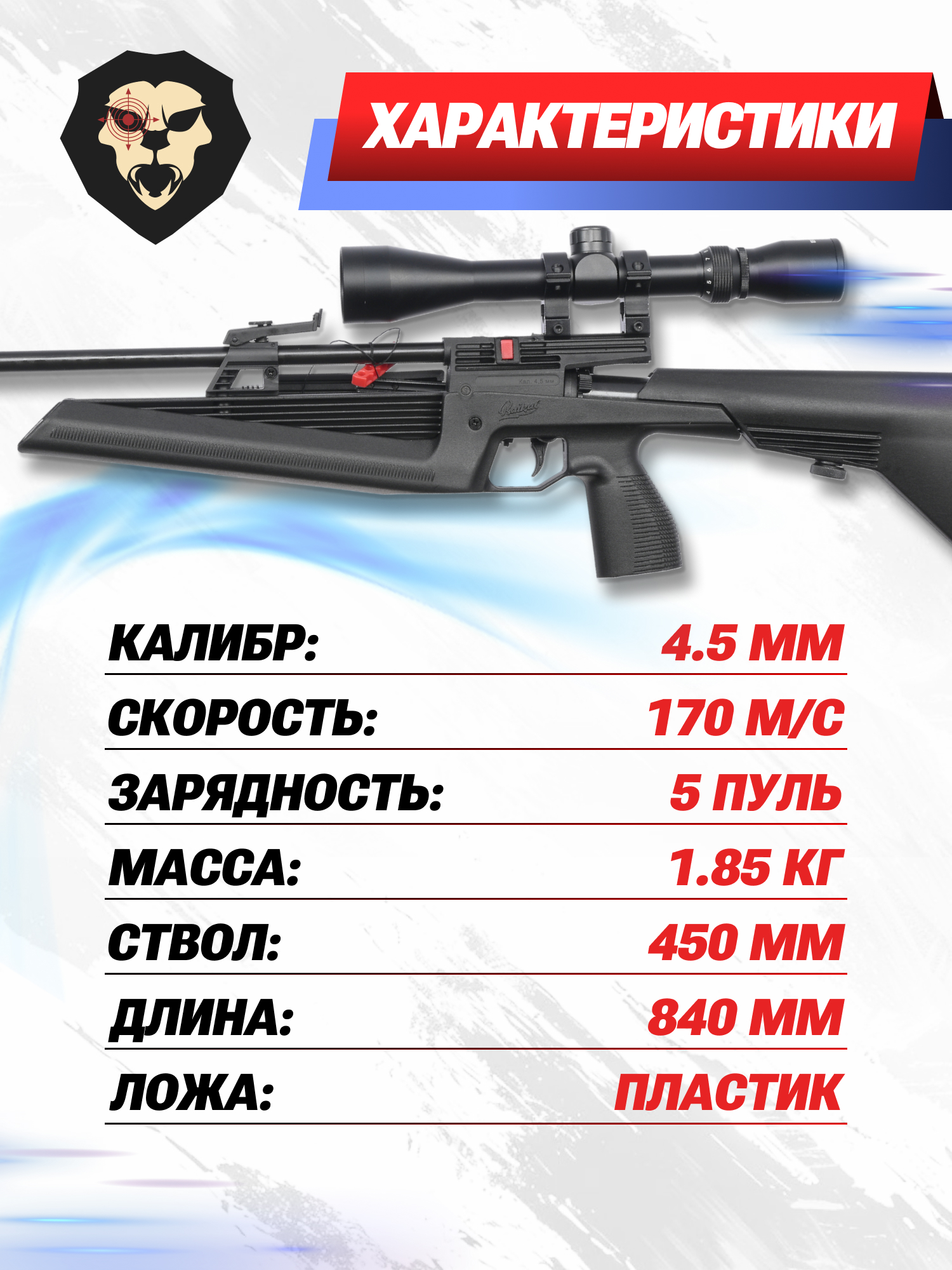 При изготовлении винтовки используют сталь и оружейный пластик, за счет чего удалось достичь компромисса между надежностью и низкой массой. Пневматика весит 1.85 килограмма, соответственно с ней получится управиться и у юниоров. Длину изделия можно выставить под себя за счет настраиваемого приклада.