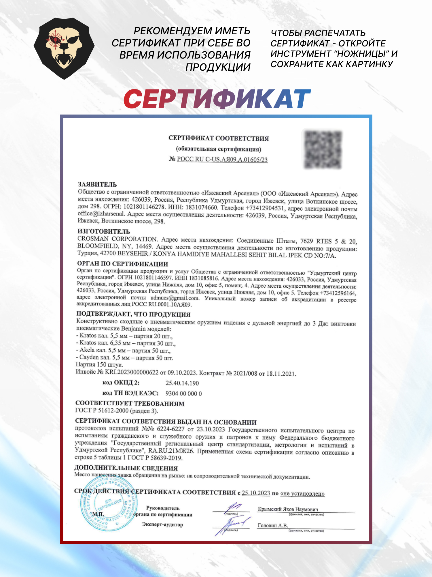 Информация о товаре "Винтовка пневматическая Crosman Benjamin Kratos 5.5 мм (Орех)" носит ознакомительный характер, и не является публичной офертой, определяемой положениями Статьи 437 Гражданского кодекса Российской Федерации, характеристики, внешний вид, цвет и комплектация могут быть изменены производителем без уведомления.