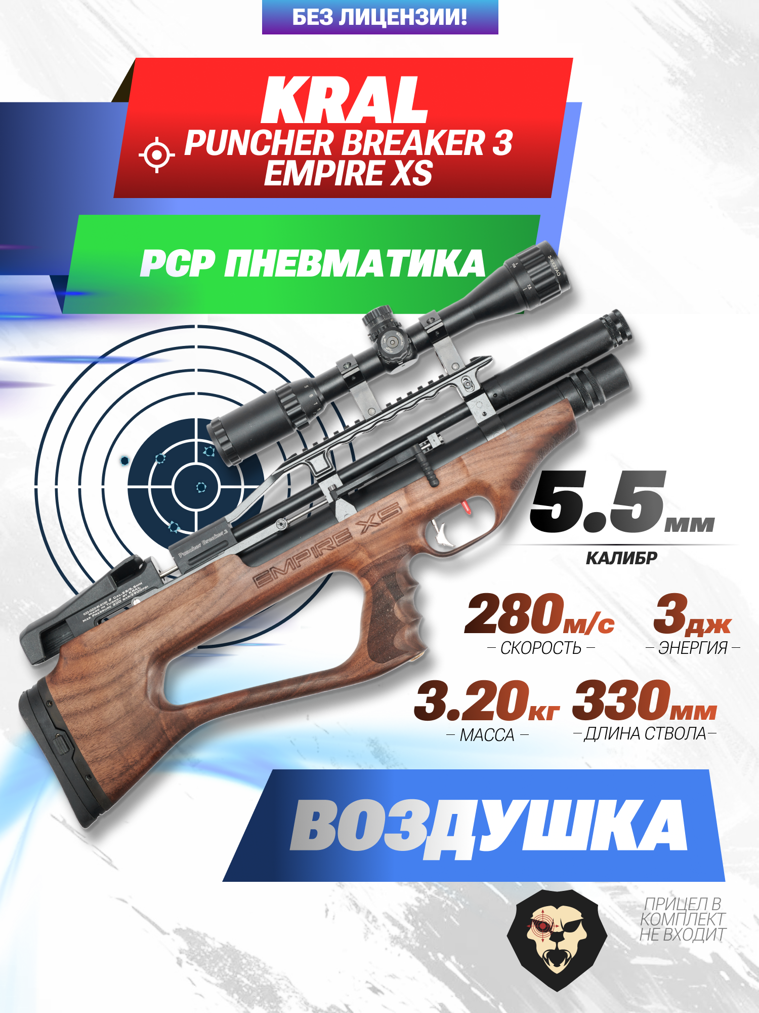 Для приобретения винтовки Крал БуллПап 5.5 Брейкер Эмпаер не требуется оформления лицензии на оружие в органах разрешительной работы благодаря тому, что энергия выстрела рассматриваемой пневматики не превышает отметки в три Дж. Образцы, прошедшие процедуру усиления, способны разгонять свинцовый снаряд до скорости больше 280 метров в секунду, благодаря чему оружие эффективно применяется как для любительской, так и профессиональной спортивной стрельбы.