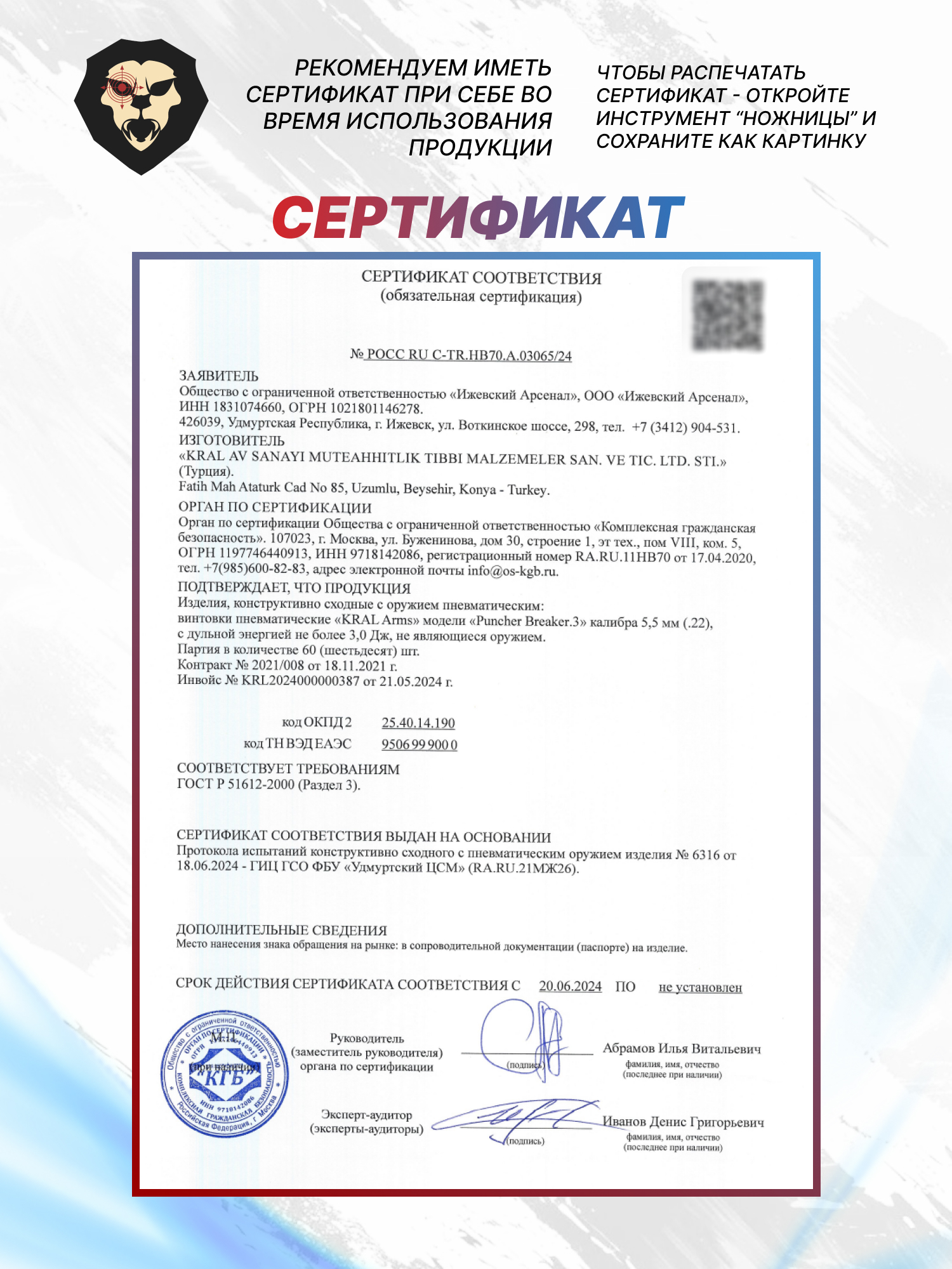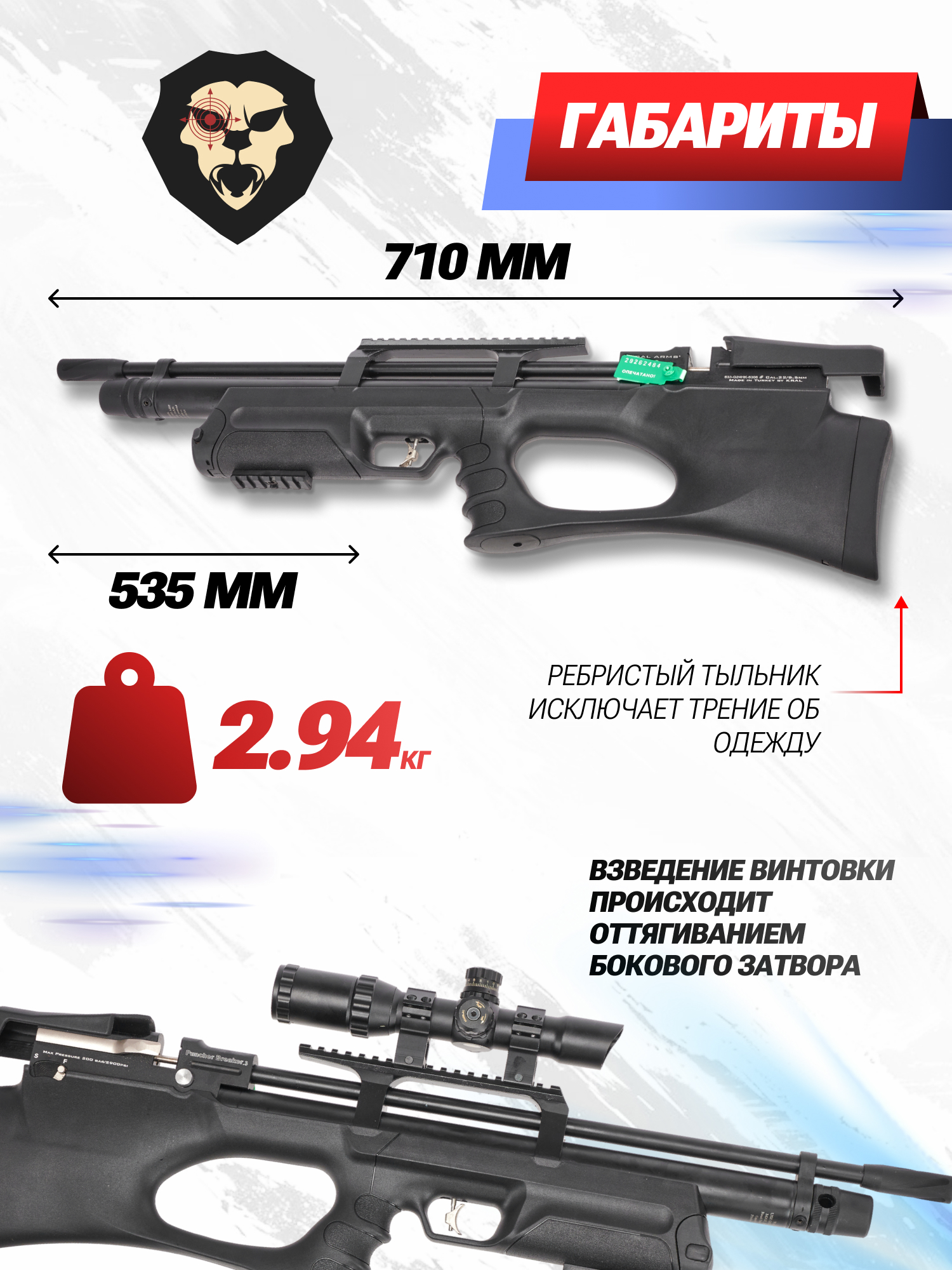 | Комплектация | Винтовка, магазин - 2 шт, заправочный штуцер, упаковка, краткая документация, копия сертификата (по запросу покупателя) |
