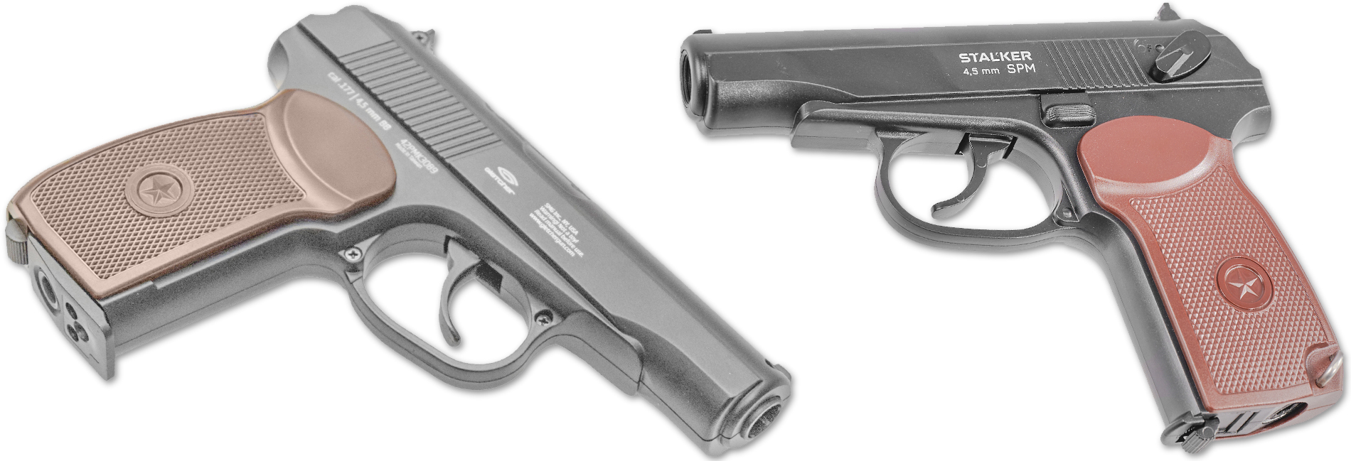 Также среди продукции предприятия присутствует пневматический пистолет Сталкер в вариации под 6 миллиметровые шарики - ее изготавливают в двух модификациях, с имитацией ПБС, и без. Ввиду спринговой конструкции это дешевейшие ПМ на рынке - для выстрела здесь потребуется вручную работать затвором. Втрое меньшая в сравнении с газобаллонным пистолетом цена позволит приобрести «мягкую» пневматику в действительности каждому.