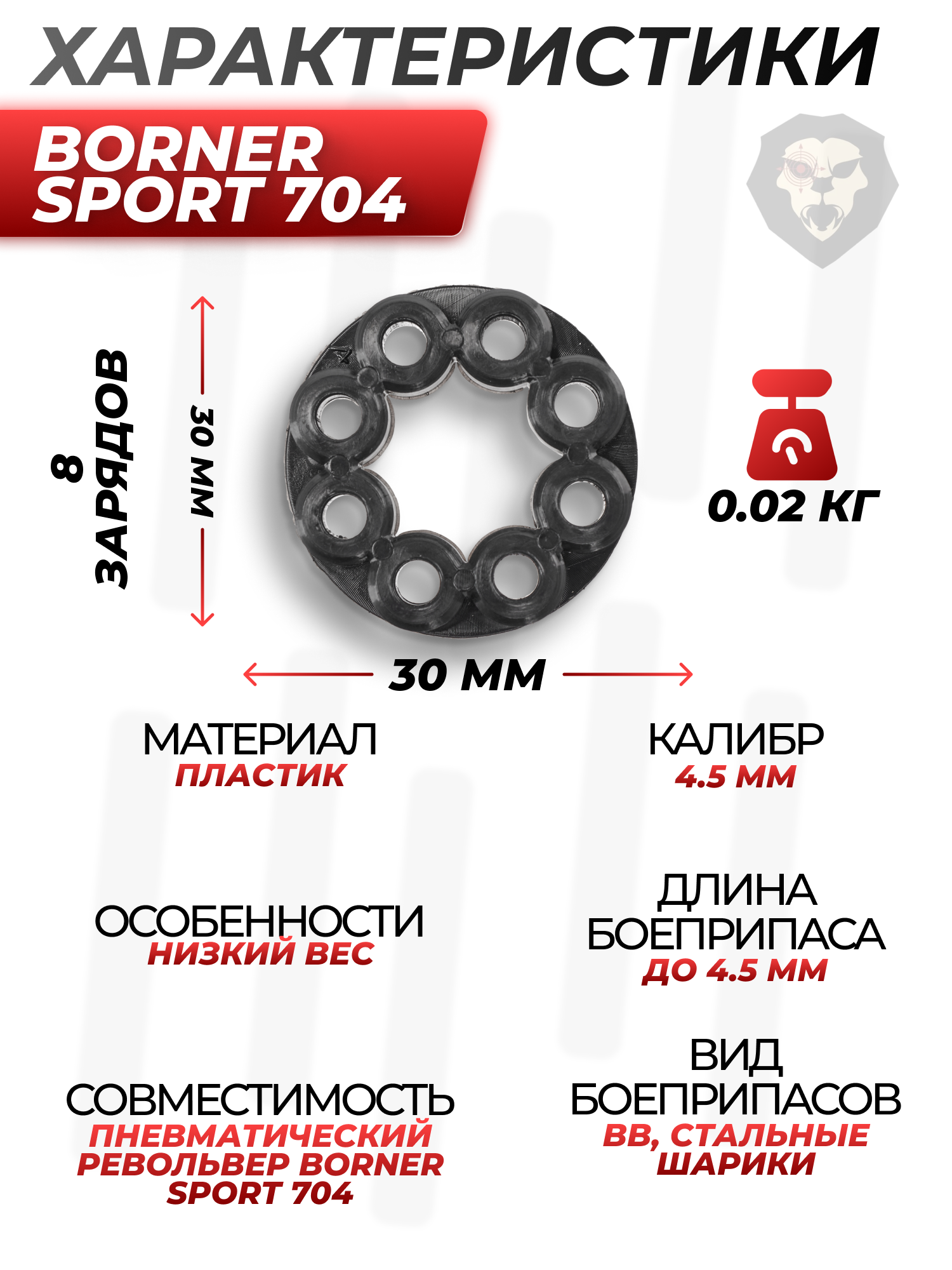 Пневматический револьвер Borner Sport 704 использует для стрельбы сферические снаряды калибра .177, следовательно, в рассматриваемый элемент боепитания размещаются пули диаметром 4.5 миллиметра. В роли материала для изготовления послужил пластик в черном цвете, поэтому образец отличается малым весом - после установки экземпляра в пистолет развесовка последнего останется на привычном уровне.