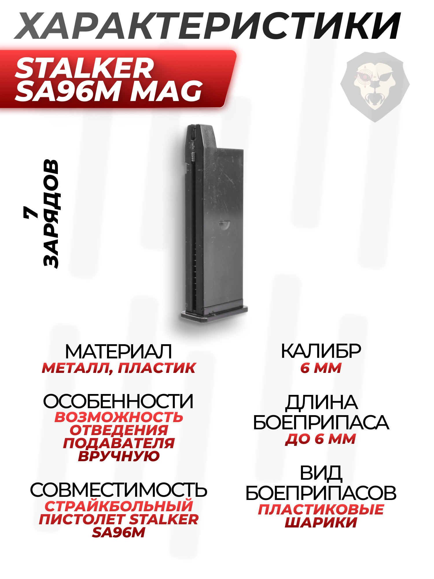 Информация о товаре "Магазин Stalker SA96M MAG (7 шаров, Mauser C96)" носит ознакомительный характер, и не является публичной офертой, определяемой положениями Статьи 437 Гражданского кодекса Российской Федерации, характеристики, внешний вид, цвет и комплектация могут быть изменены производителем без уведомления.