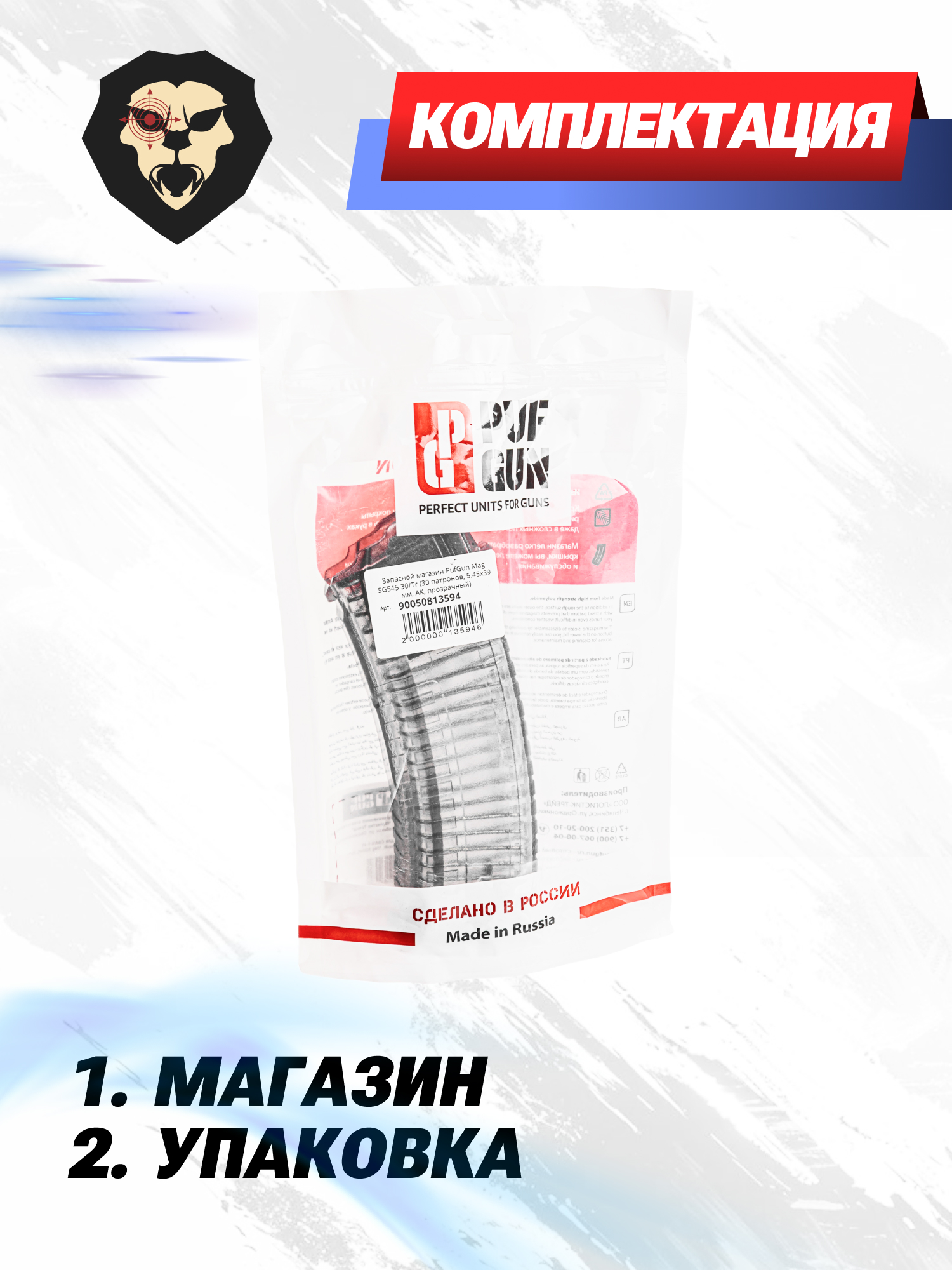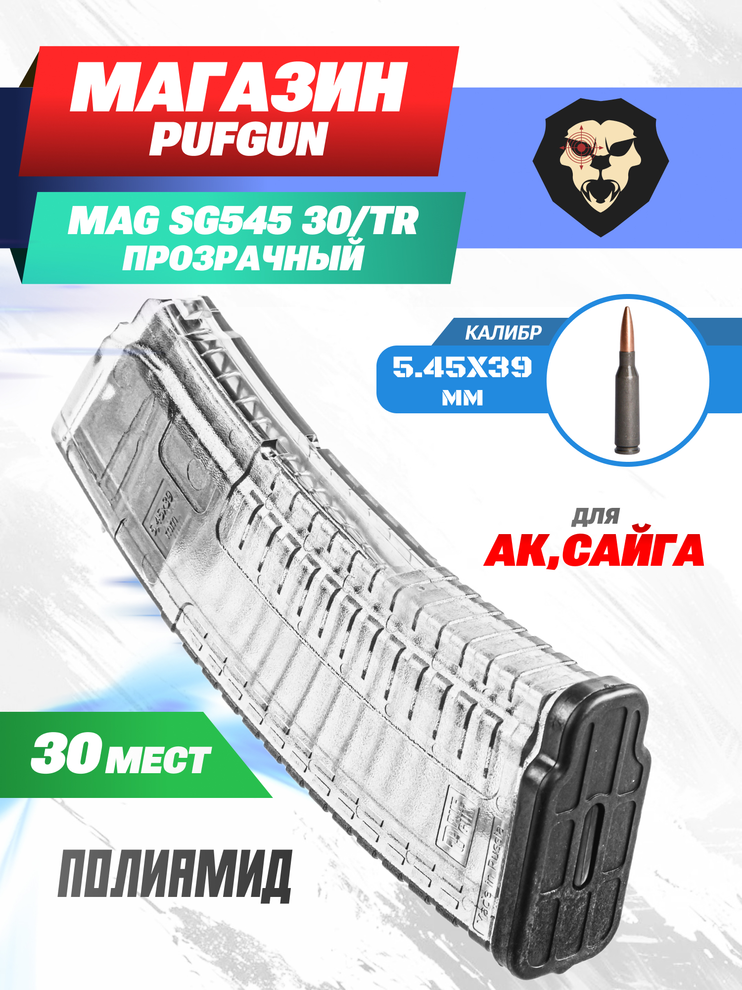 Информация о товаре "Запасной магазин PufGun Mag SG545 30/Tr (30 патронов, 5.45х39 мм, АК, прозрачный)" носит ознакомительный характер, и не является публичной офертой, определяемой положениями Статьи 437 Гражданского кодекса Российской Федерации, характеристики, внешний вид, цвет и комплектация могут быть изменены производителем без уведомления.