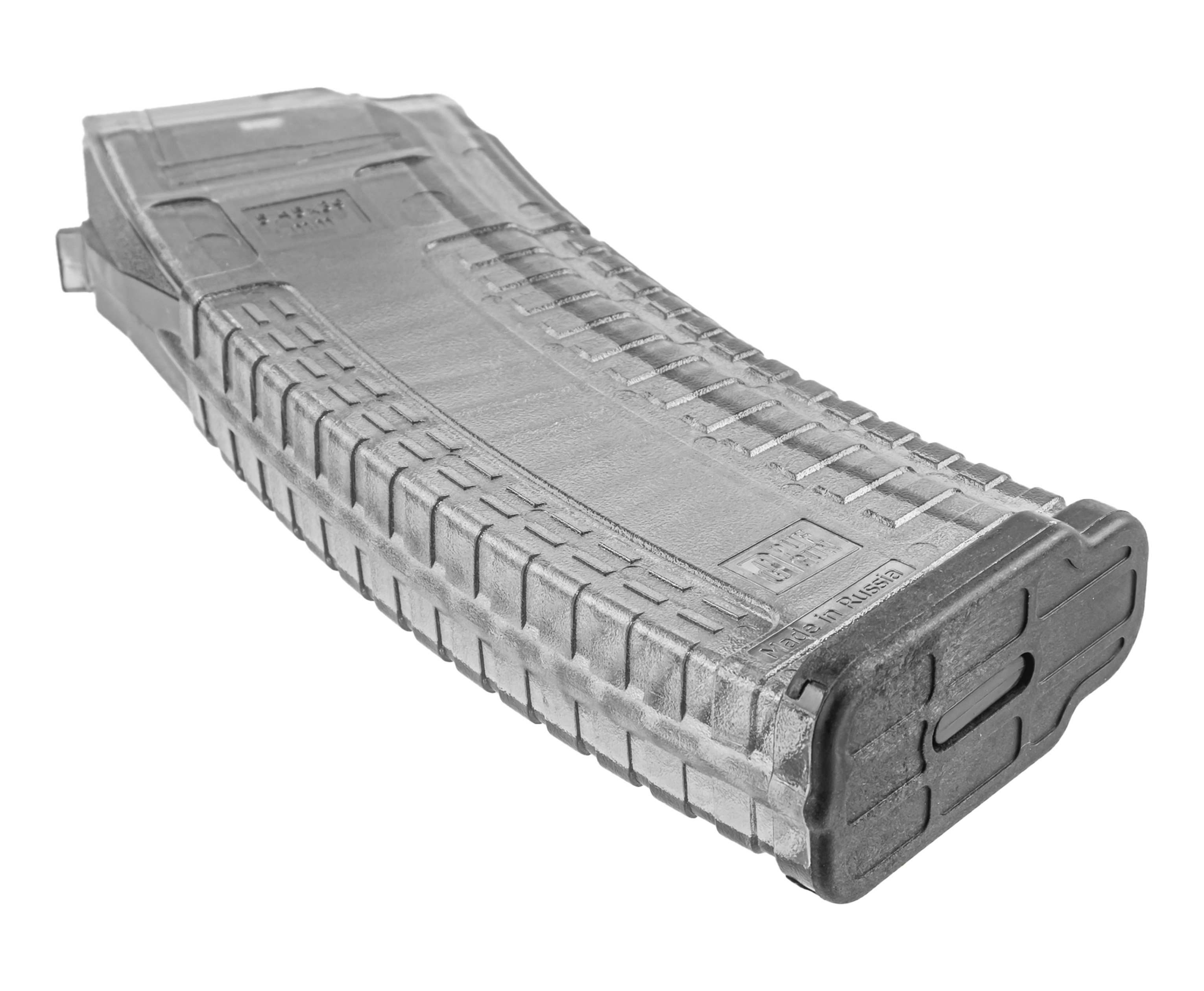 Образец двухрядный, емкостью на 30 патронов - классический конструктив проверен временем. Для изготовления магазина используют поликарбонат - материал отличается прочностью, долговечностью и меньшей массой в сравнении с иными полимерами. Вес собранного магазина равен 195 граммам, что ощутимо легче заводских вариаций.