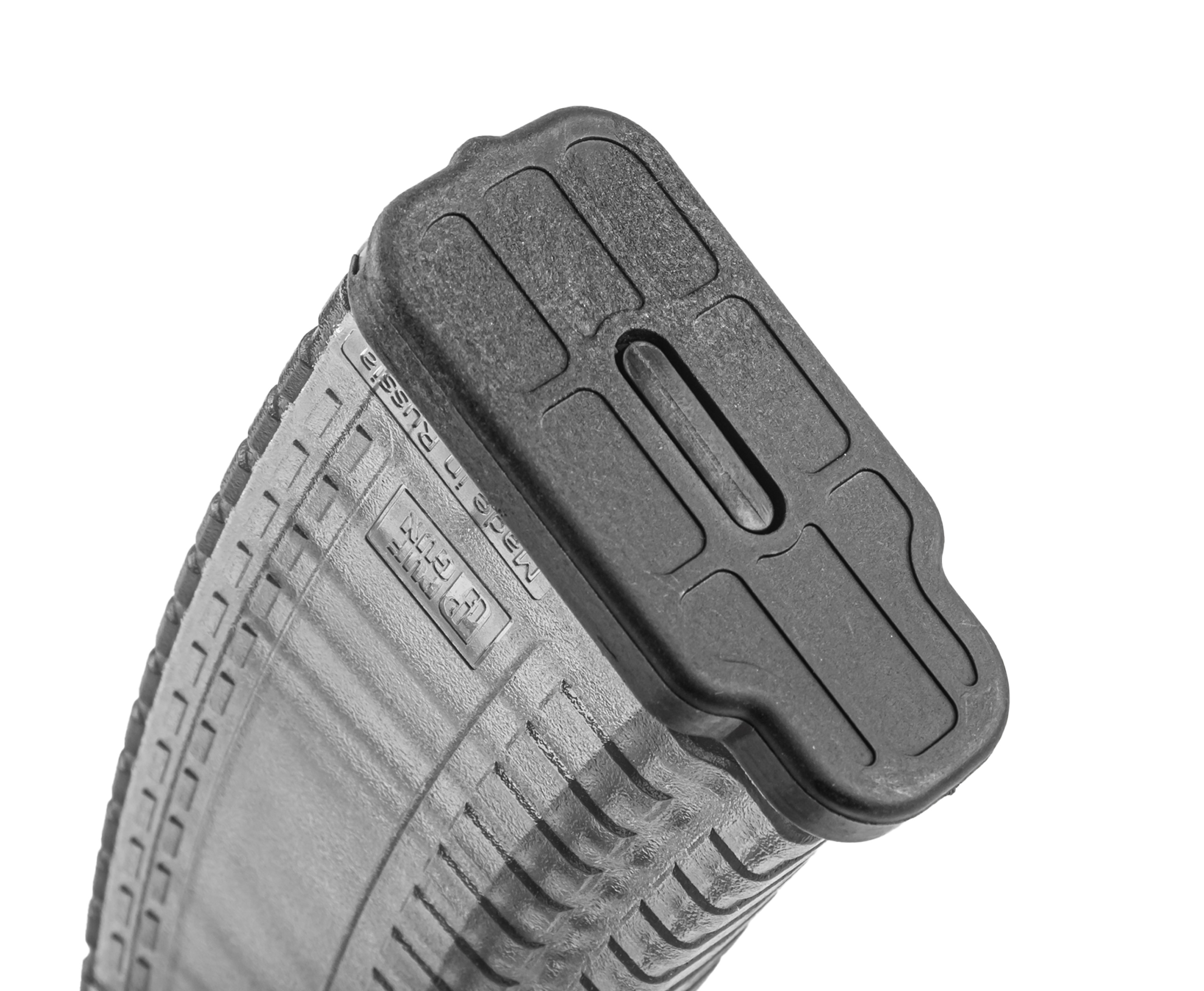 Магазин PufGun 5.45 мм располагает доработанным механизмом фиксации пятки. При необходимости получения доступа к пружине и подавателю потребуется утопить кнопку крепления внутрь, после чего можно будет снять рассматриваемую деталь.