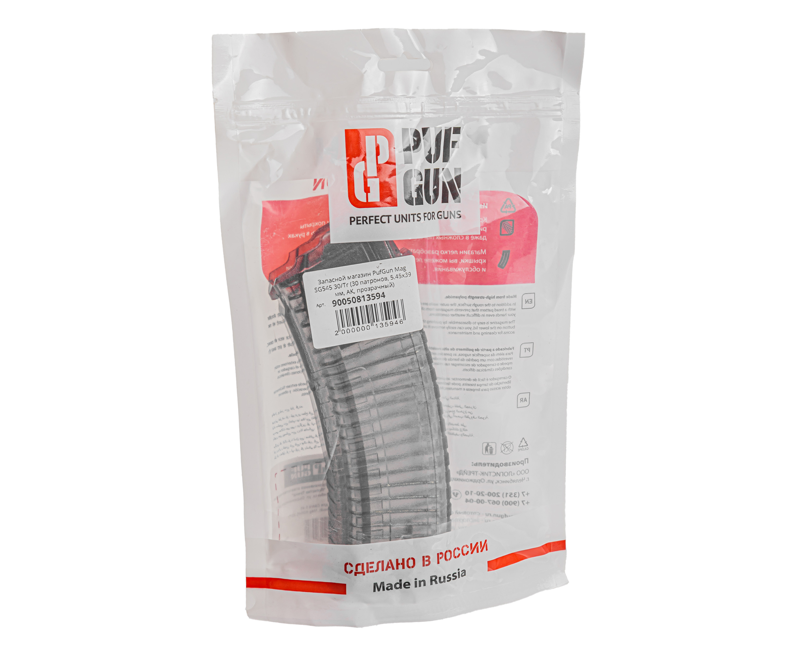 Информация о товаре "Запасной магазин PufGun Mag SG545 30/Tr (30 патронов, 5.45х39 мм, АК, прозрачный)" носит ознакомительный характер, и не является публичной офертой, определяемой положениями Статьи 437 Гражданского кодекса Российской Федерации, характеристики, внешний вид, цвет и комплектация могут быть изменены производителем без уведомления.