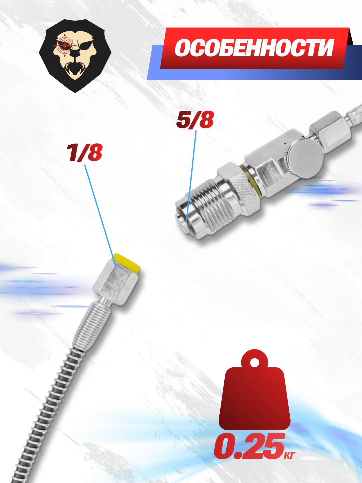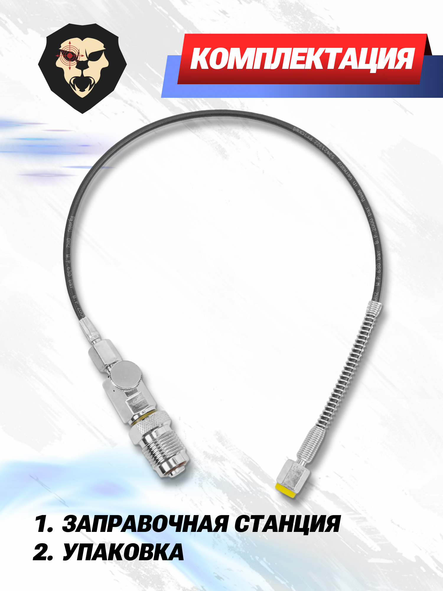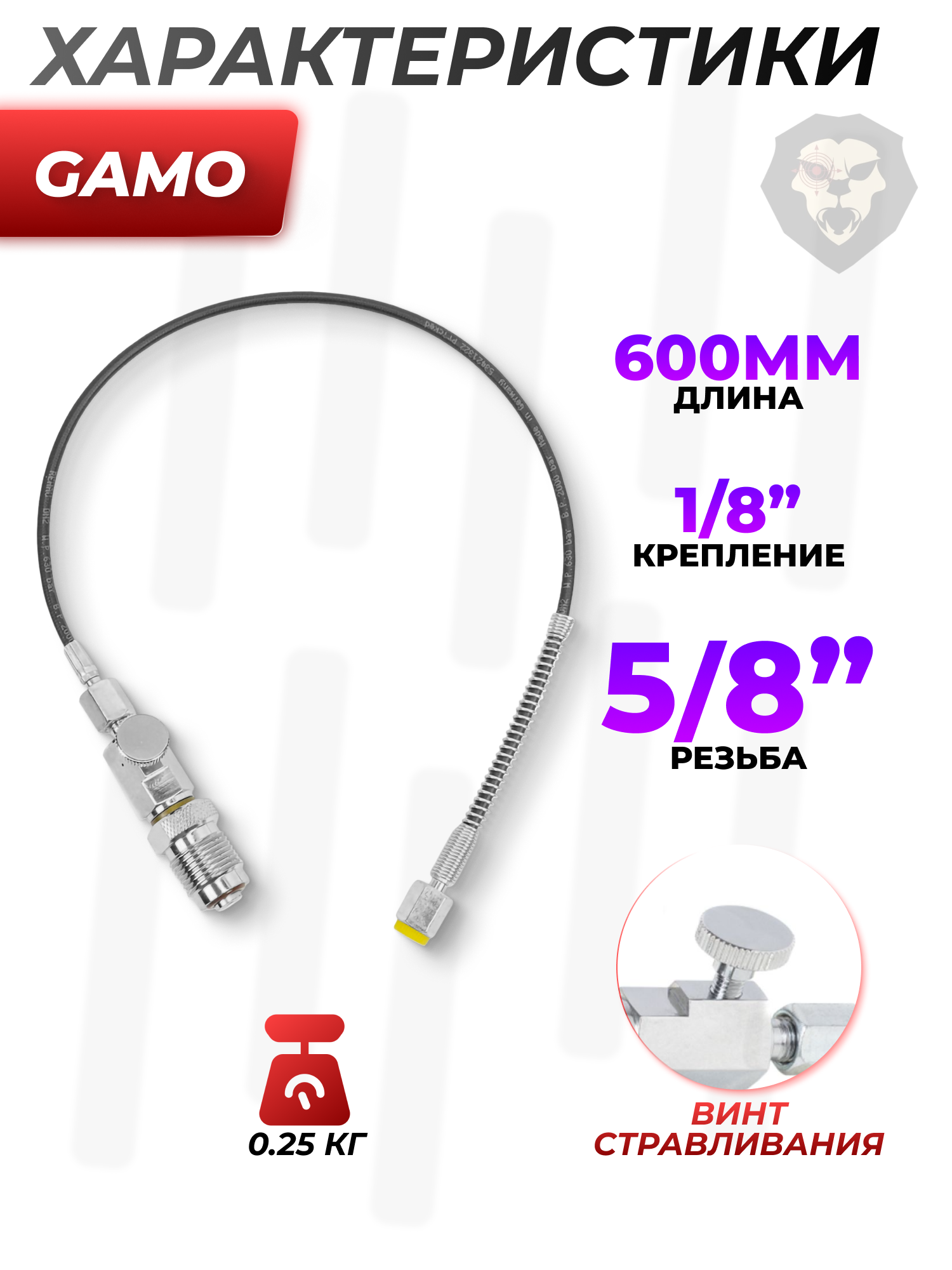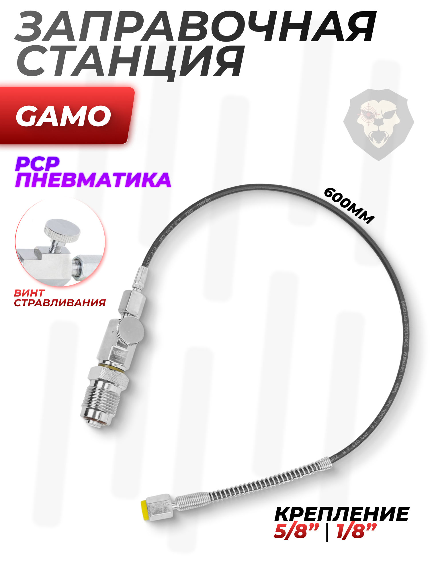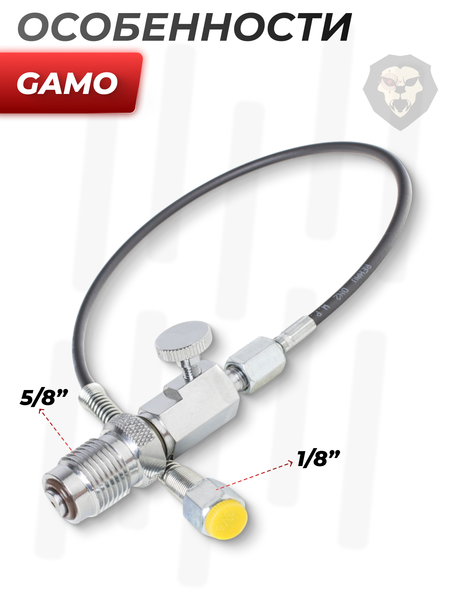 К разряду приспособлений такого рода относится обозреваемое изделие от фирмы Gamo. Система представляет собой гибкий шланг и служит для накачки воздуха непосредственно в соответствующий резервуар пневматического оружия путем подключения напрямую к баллону ВД. Для этого с одной стороны предусмотрена стандартная резьба 5/8 папа - для затягивания соединения есть площадка под гаечный ключ.