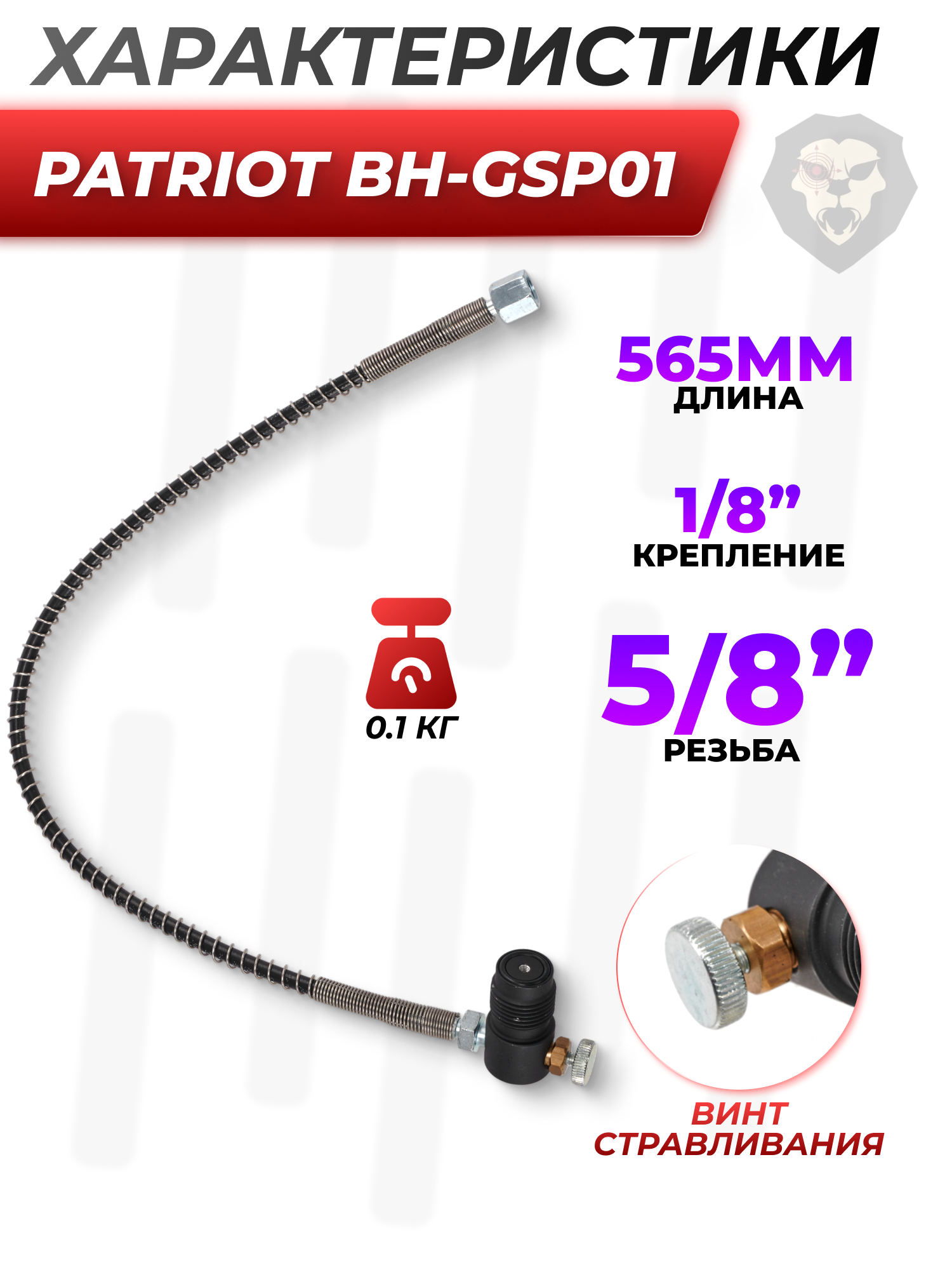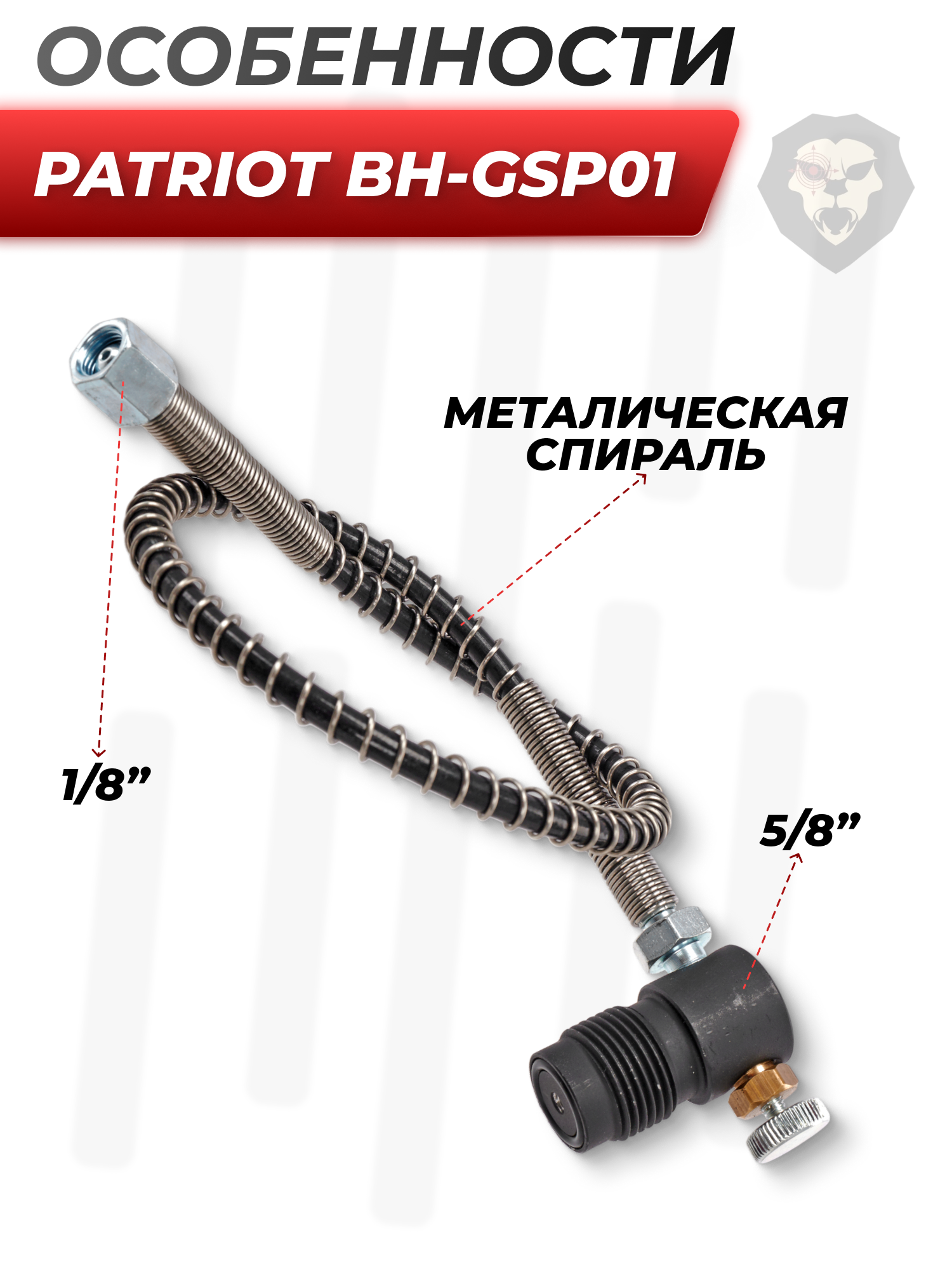 Помимо использования ручных насосов и электрических компрессоров, для накачки встроенного ресивера ПСП пневматики практикуется подсоединение резервуара винтовки к баллонам со сжатым газом. Для этих целей фирма Патриот выпускает специальные заправочные станции с различной длиной шланга. Конкретная модель BH-GSP01 подойдет для владельцев «воздушек» с резьбовыми штуцерами.
