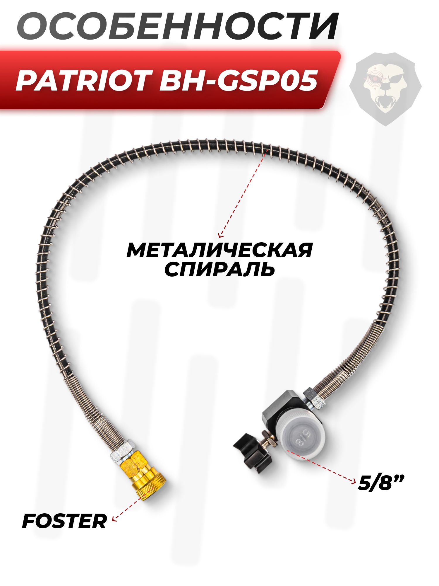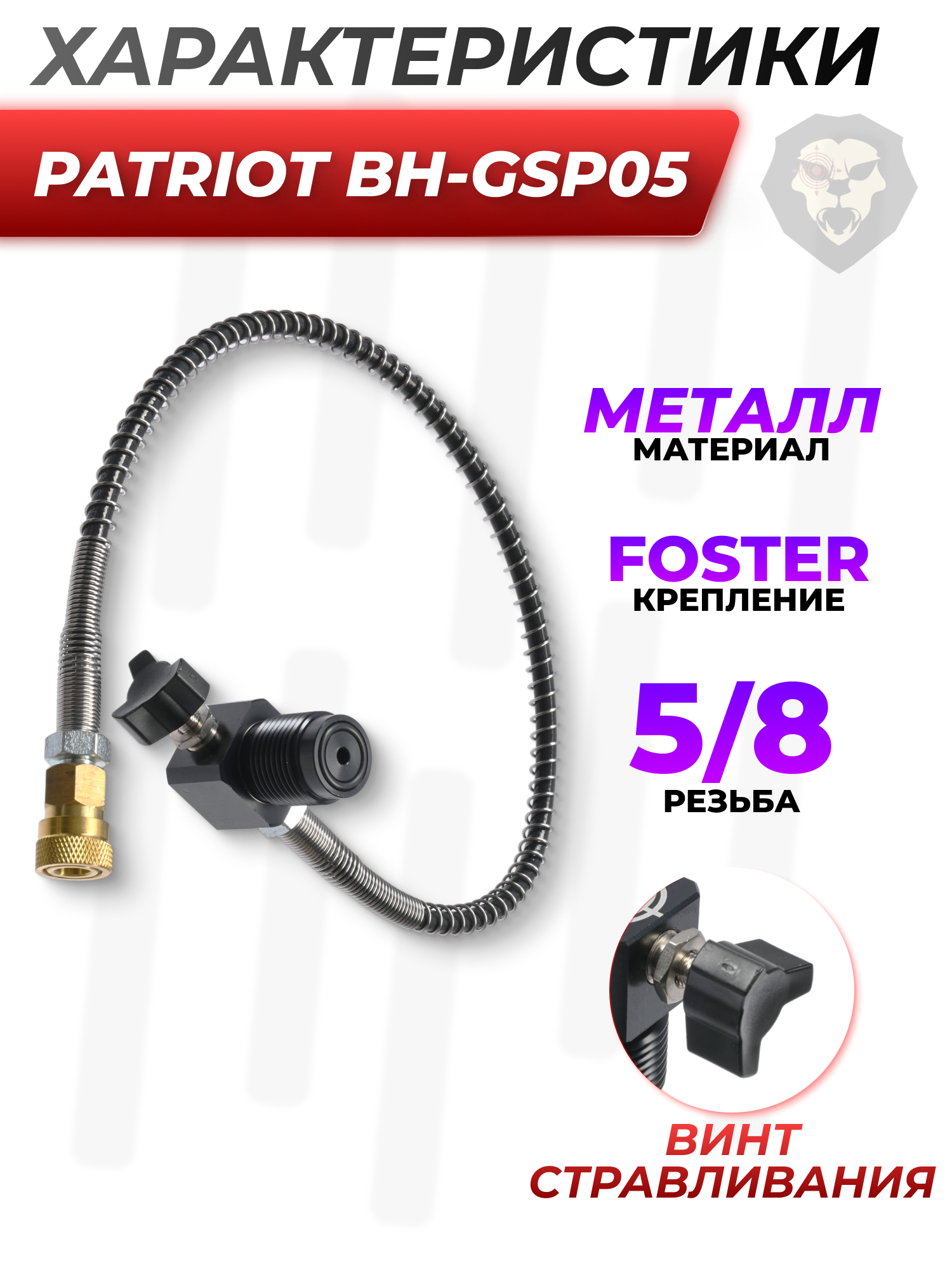 Станция Патриот представленного типа выполнена из качественных материалов, что положительно сказывается на надежности и сроке службы аксессуара. Установлен шланг из высокоплотной резины, а от внешних повреждений и перегиба его защищает армирование проволокой - в свою очередь, соединительные узлы изготавливаются из нержавеющей стали. Головная часть совмещается с баллоном ВД через резьбу «папа» 5/8 дюйма, при этом заявлено наличие разъема Foster под оперативную смену соответствующих штуцеров Quick типа.
