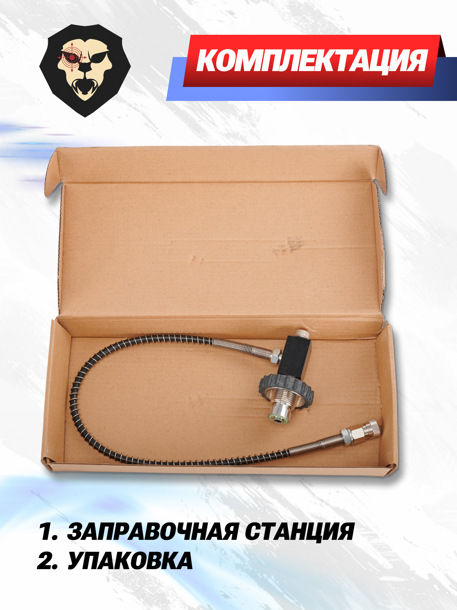 Заправочная станция для PCP винтовок Patriot совмещается с газовым баллоном ВД при помощи резьбы 5/8 «папа» - для удобства изготовитель предусмотрел наличие внешнего кольца увеличенного размера с ребристой поверхностью, ввиду чего затяжка соединения происходит вручную. Корпус разъема снабжен клапаном - перекрытие подачи газа осуществляется вентилем с торцевой части. С противоположной стороны шланга присутствует разъем Foster, при помощи которого к системе оперативно крепятся совместимые штуцеры типа Quick для подключения к порту винтовки.