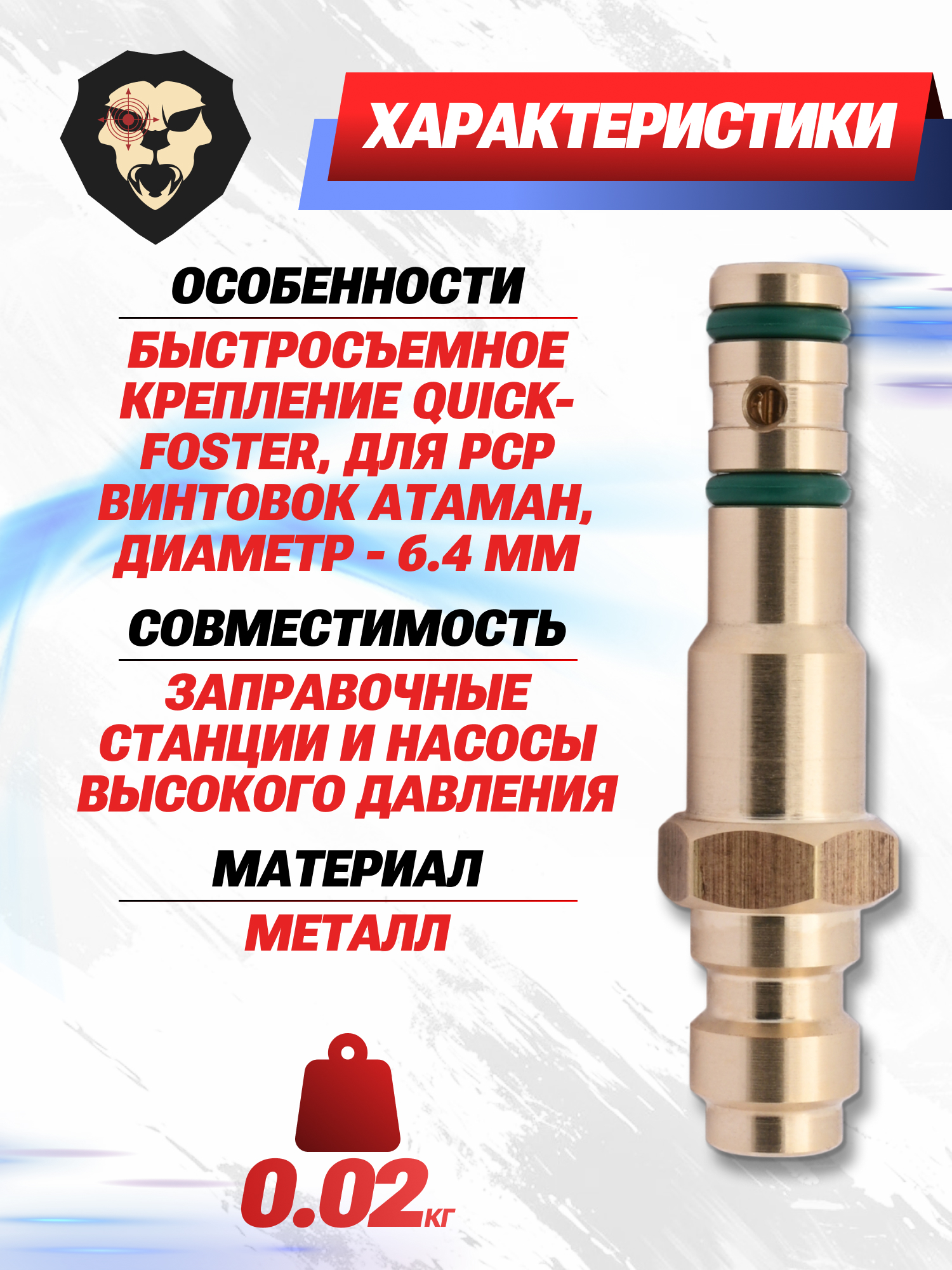 | Особенности | Быстросъемное крепление Quick-foster, для PCP винтовок Атаман, диаметр - 6.4 мм |