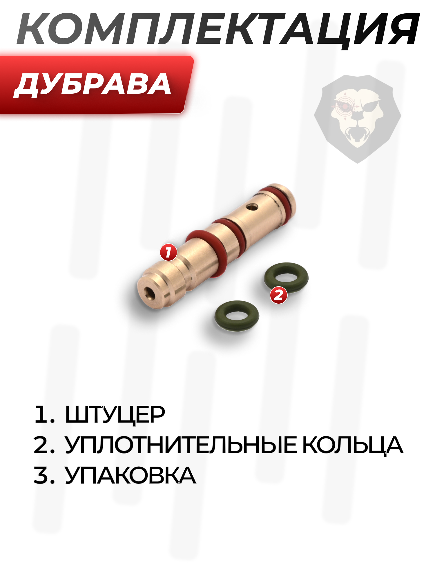 Zark штуцер обрабатывается из цельной заготовки на высокоточном станке, а в качестве материала выступает сплав металла, который имеет устойчивость к коррозионному воздействию. Чтобы не допустить потерь воздуха при накачке резервуара винтовки, изготовитель предусмотрел уплотнительные кольца. При их износе в комплекте идут запасные оринги.