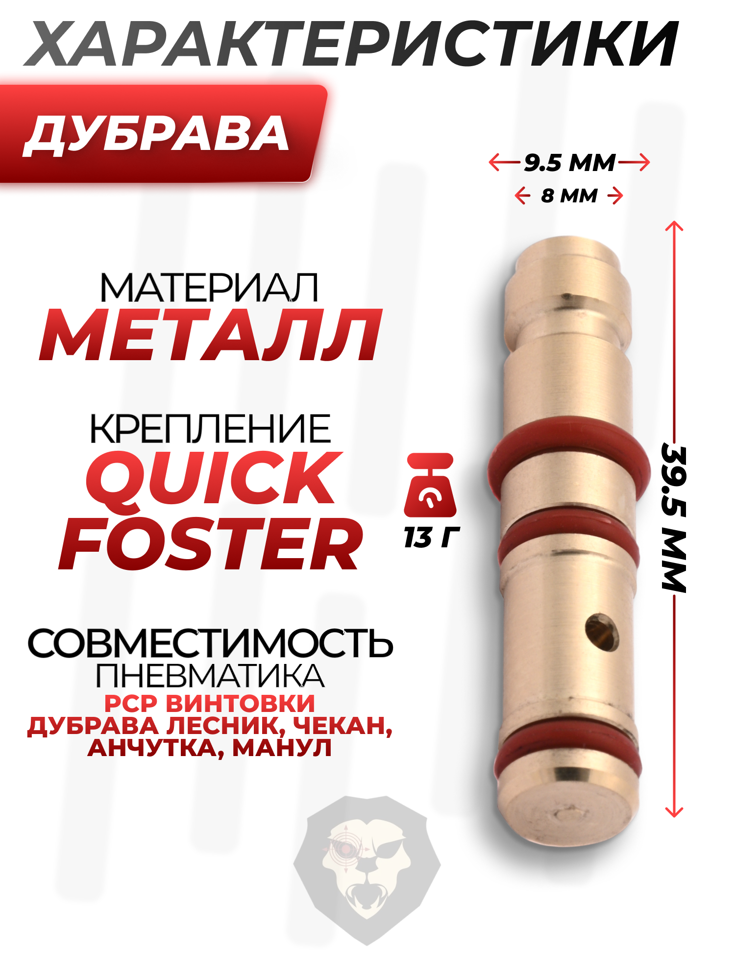 | Особенности | Быстросъемное крепление Quick-foster, для PCP винтовок Дубрава Лесник, Чекан, Анчутка, Манул, диаметр - 8 мм |