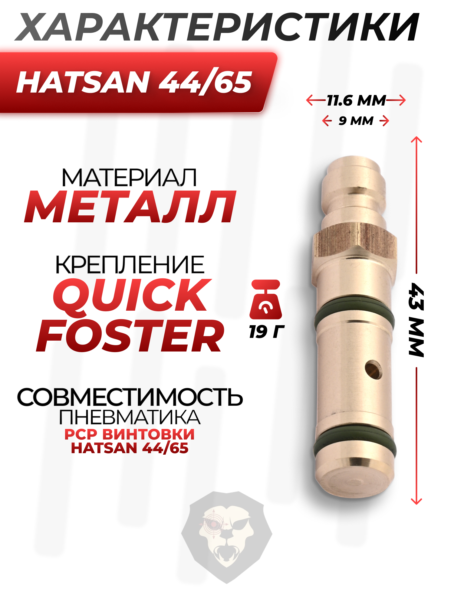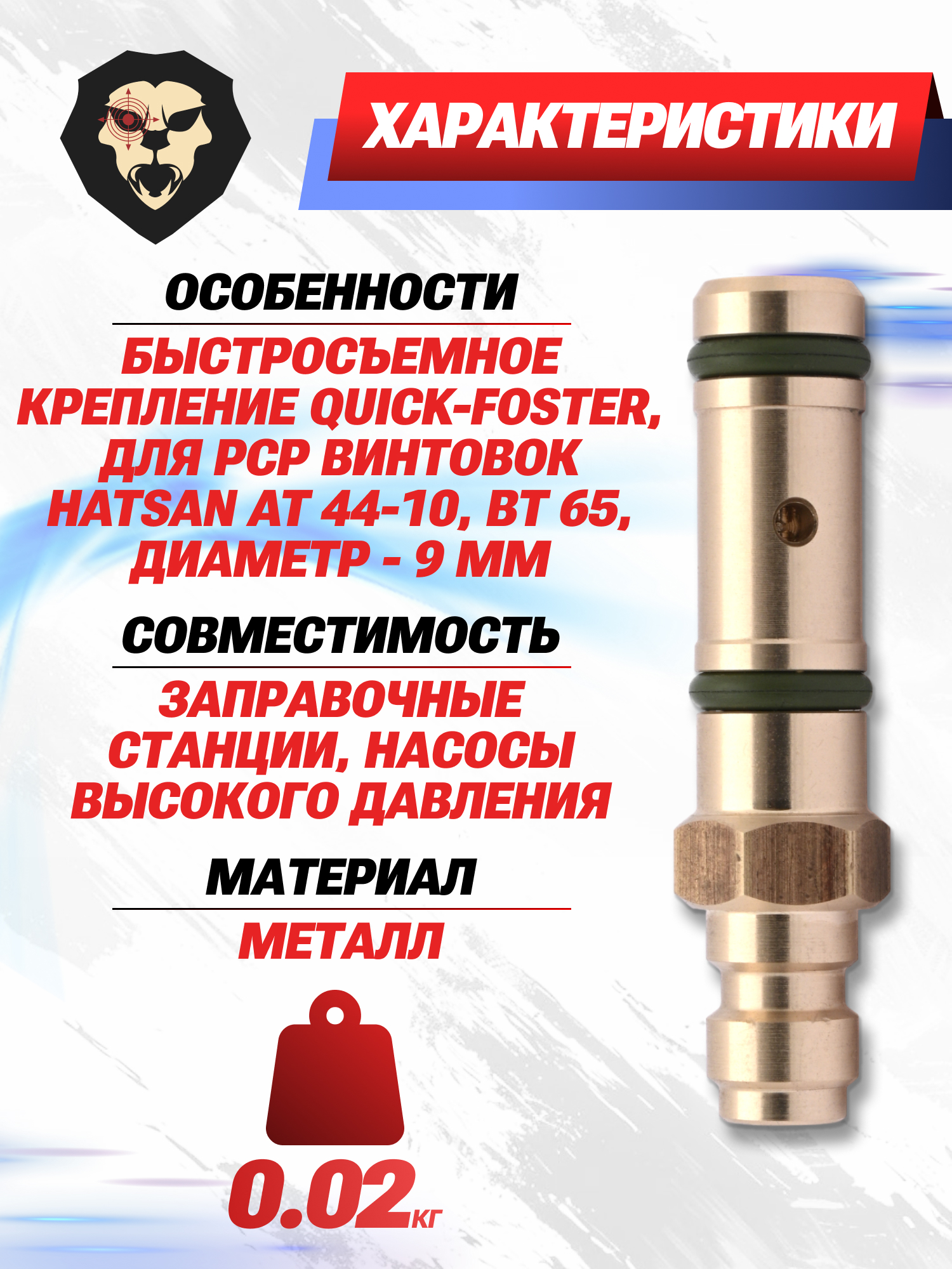 | Особенности | Быстросъемное крепление Quick-foster, для PCP винтовок Hatsan AT 44-10, BT 65, диаметр - 9 мм |