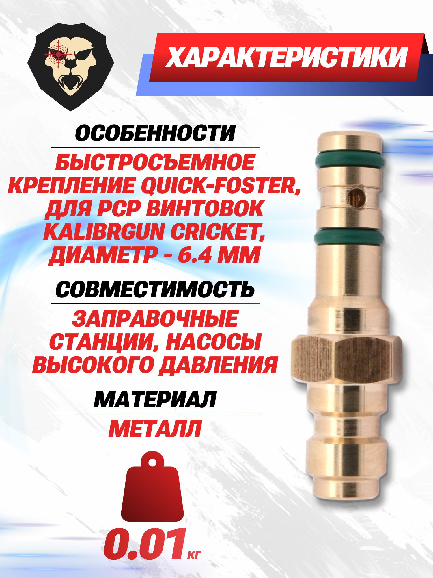 | Особенности | Быстросъемное крепление Quick-foster, для PCP винтовок Kalibrgun Cricket, диаметр - 6.4 мм |