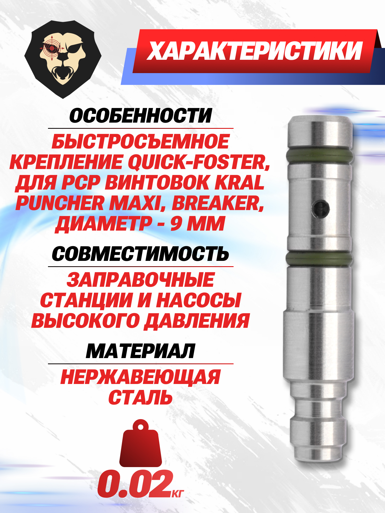 | Особенности | Быстросъемное крепление Quick-foster, для PCP винтовок Kral Puncher Maxi, Breaker, диаметр - 9 мм |