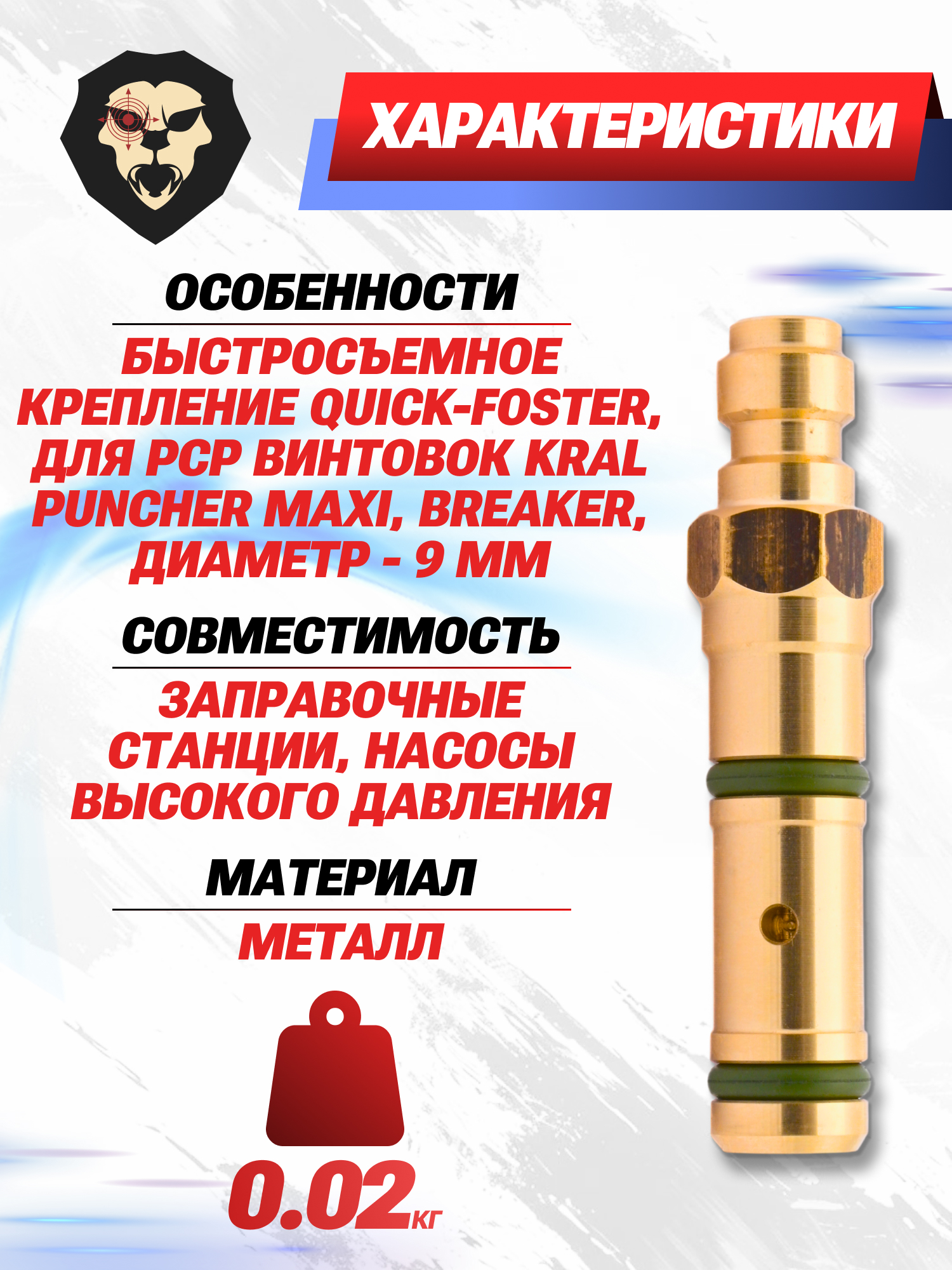 | Особенности | Быстросъемное крепление Quick-foster, для PCP винтовок Kral Puncher Maxi, Breaker, диаметр - 9 мм |