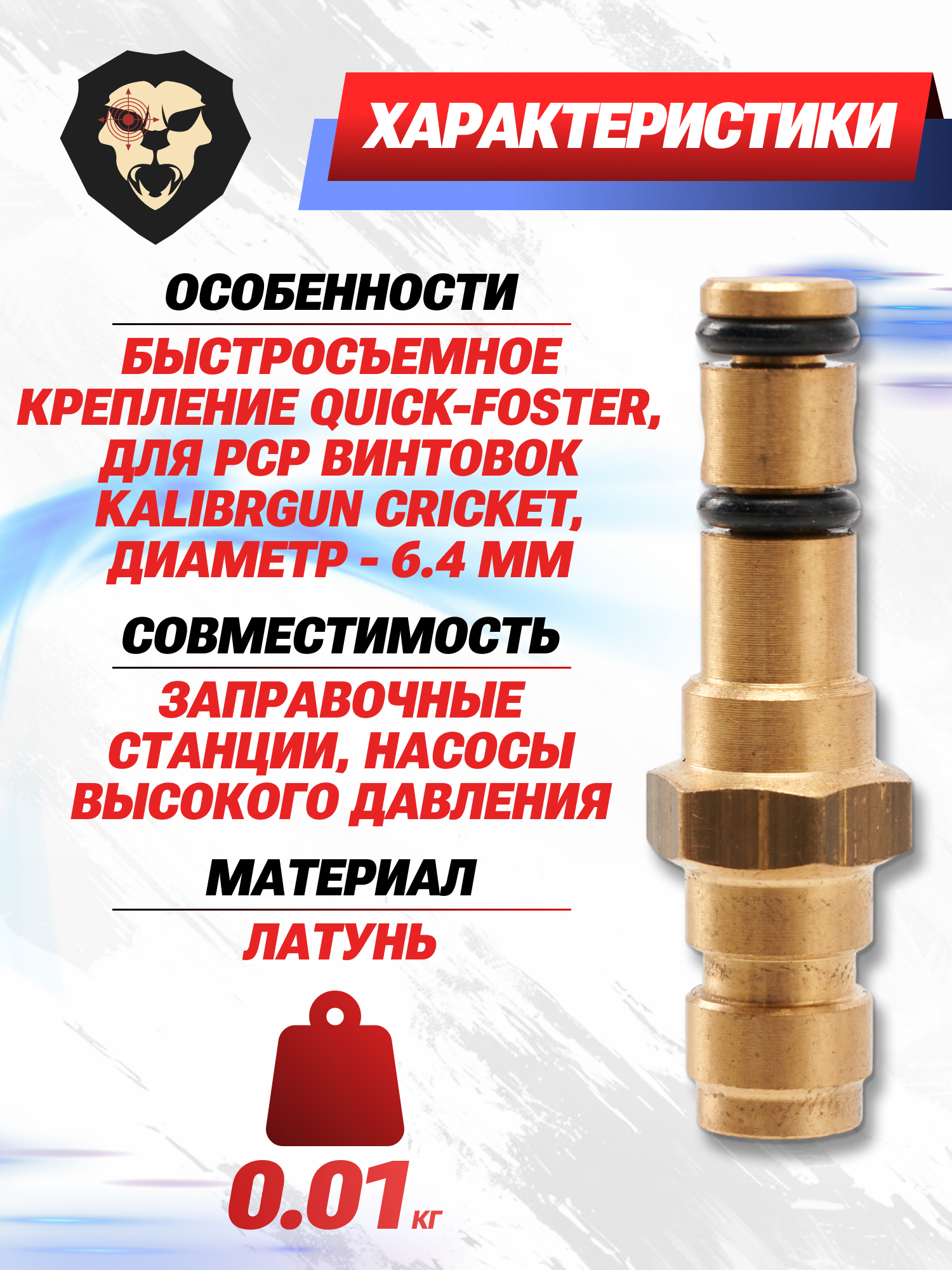 | Особенности | Быстросъемное крепление Quick-foster, для PCP винтовок Kalibrgun Cricket, диаметр - 6.4 мм |