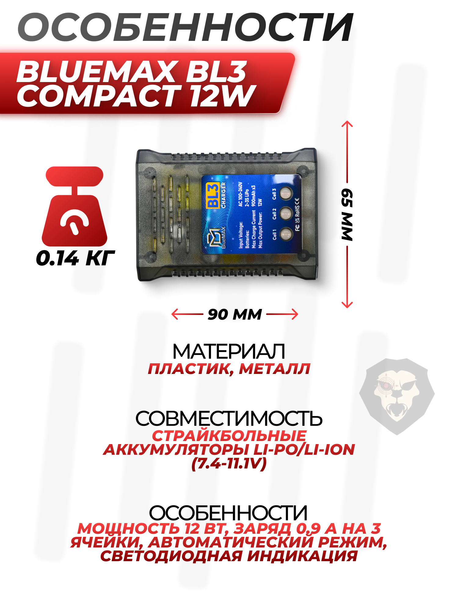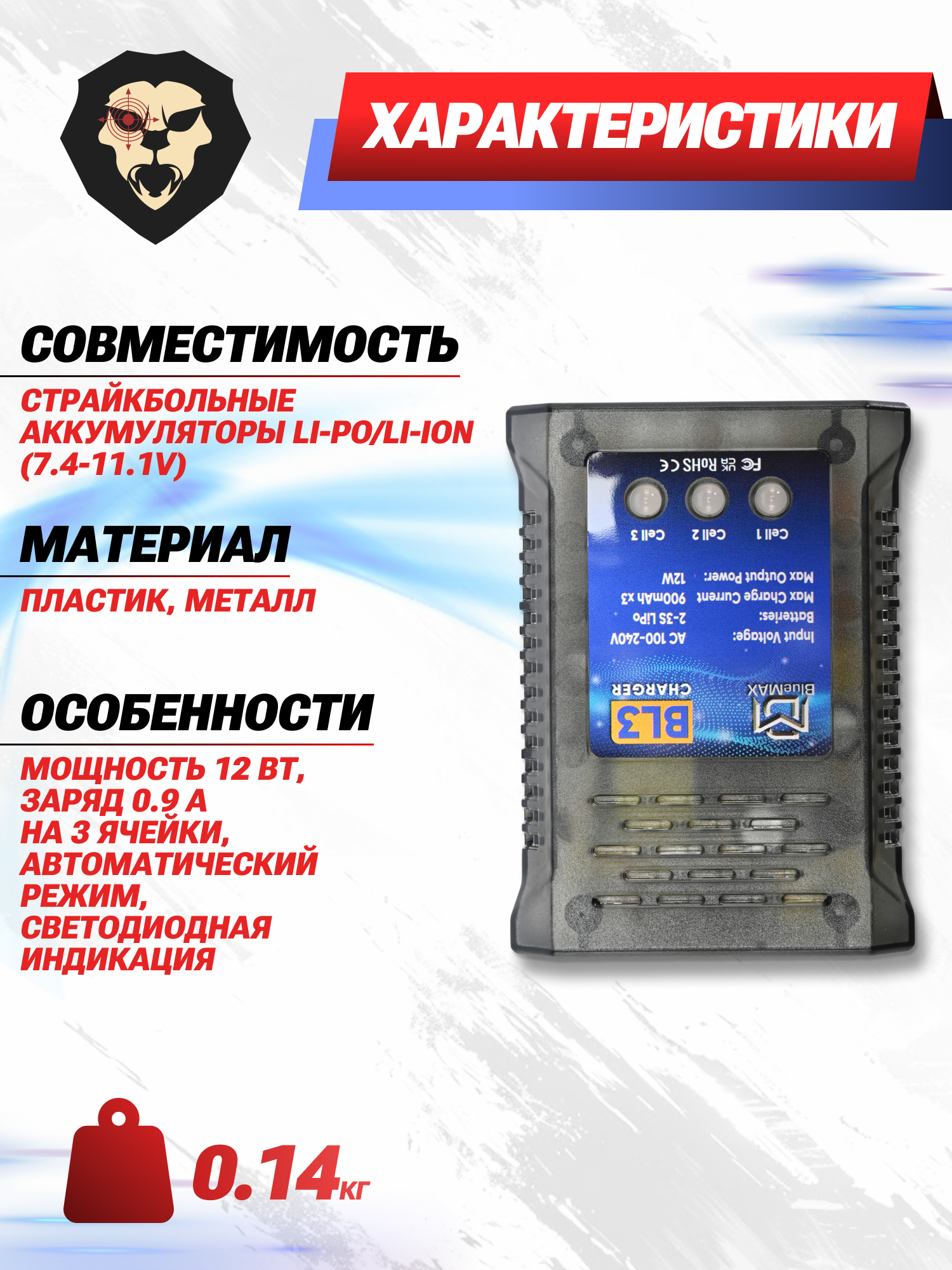 Популярная компания BlueMax знакома многим любителям военно-тактических страйкбольных игр. Фирма специализируется на производстве качественных и недорогих аккумуляторов, запитывающих электроприводы эйросфт автоматов и винтовок. Расширяя ассортимент, компания представила собственную линейку зарядных устройств, которые соответствуют критериям безопасного восстановления емкости батарей, что положительно сказывается на сроке службы энергоносителей.